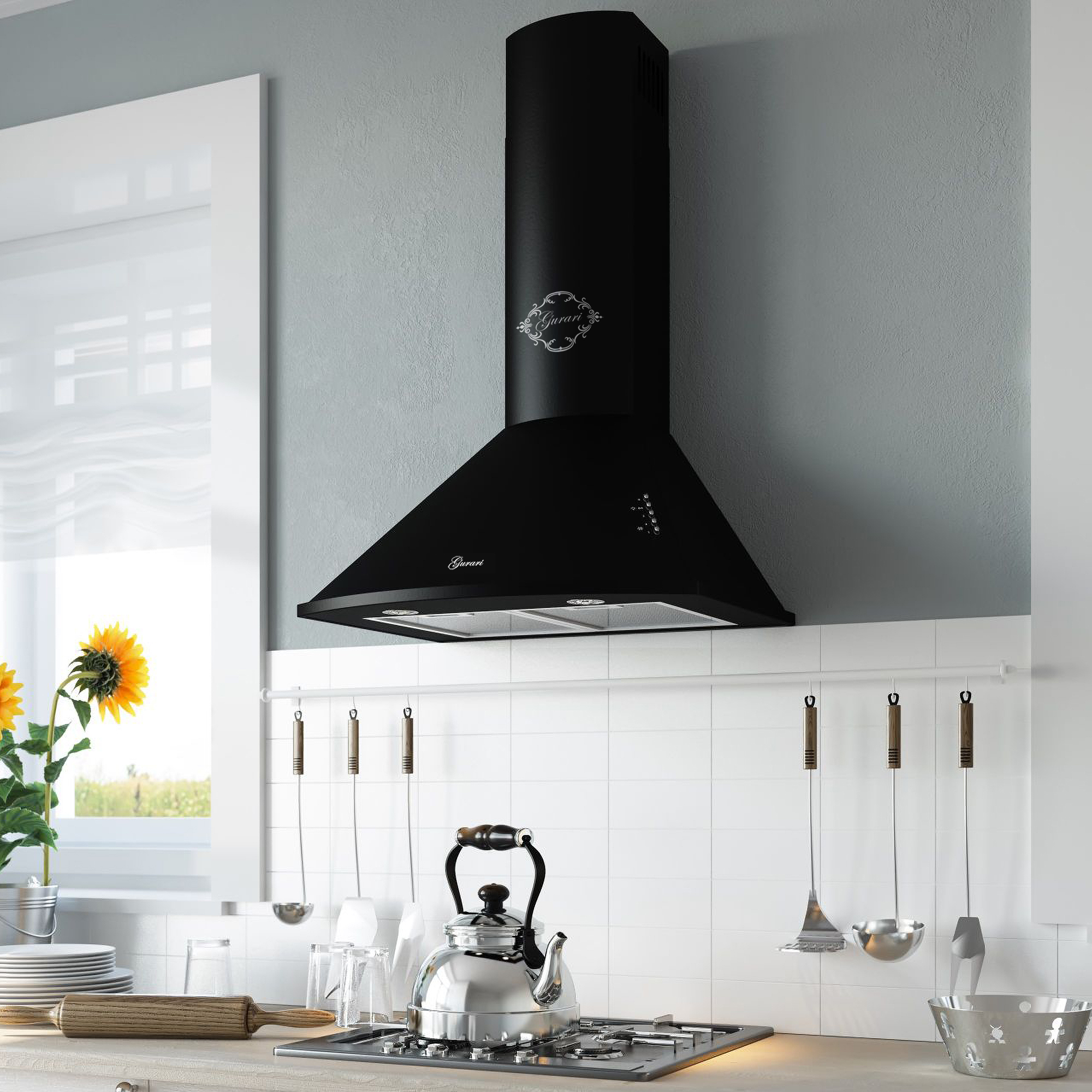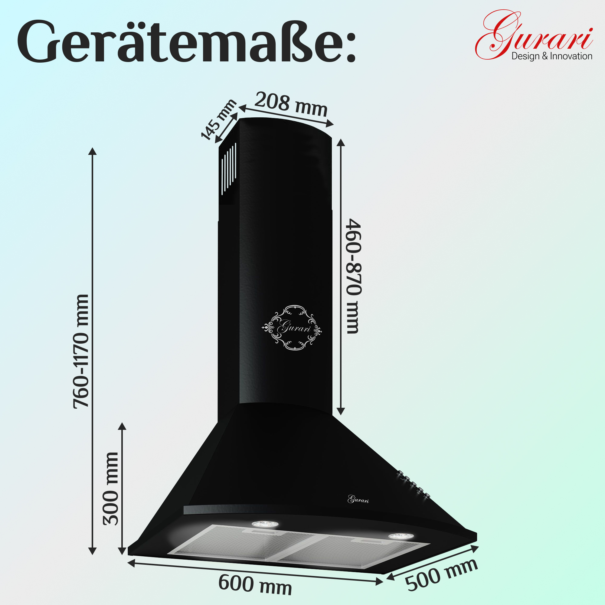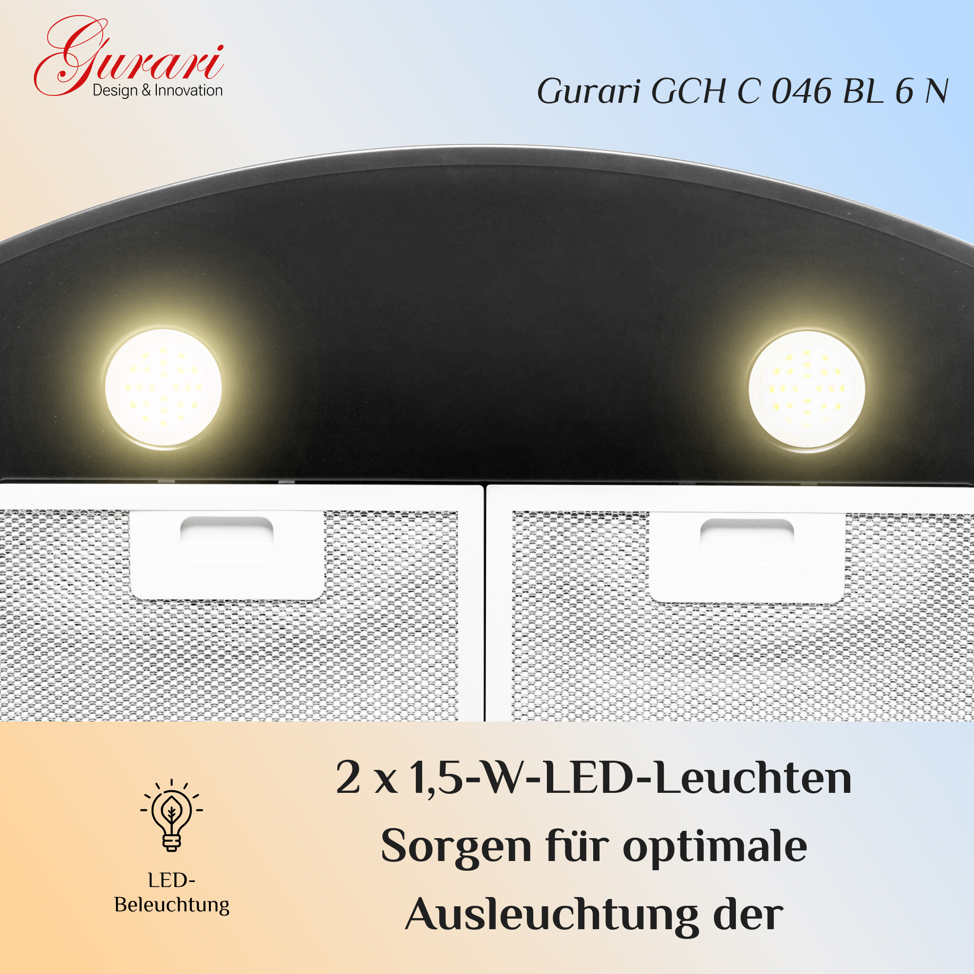 Das Modell GCH C 046 BL 6 N ist eine moderne Dunstabzugshaube in klassischer Bauweise. Korpus und Kamin sind schwarz lackiert.