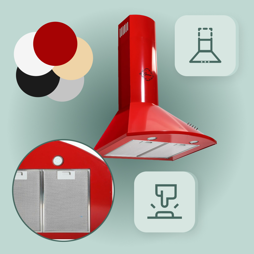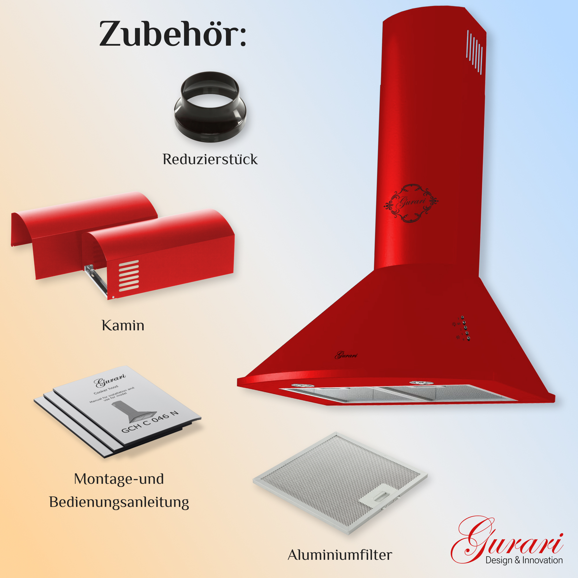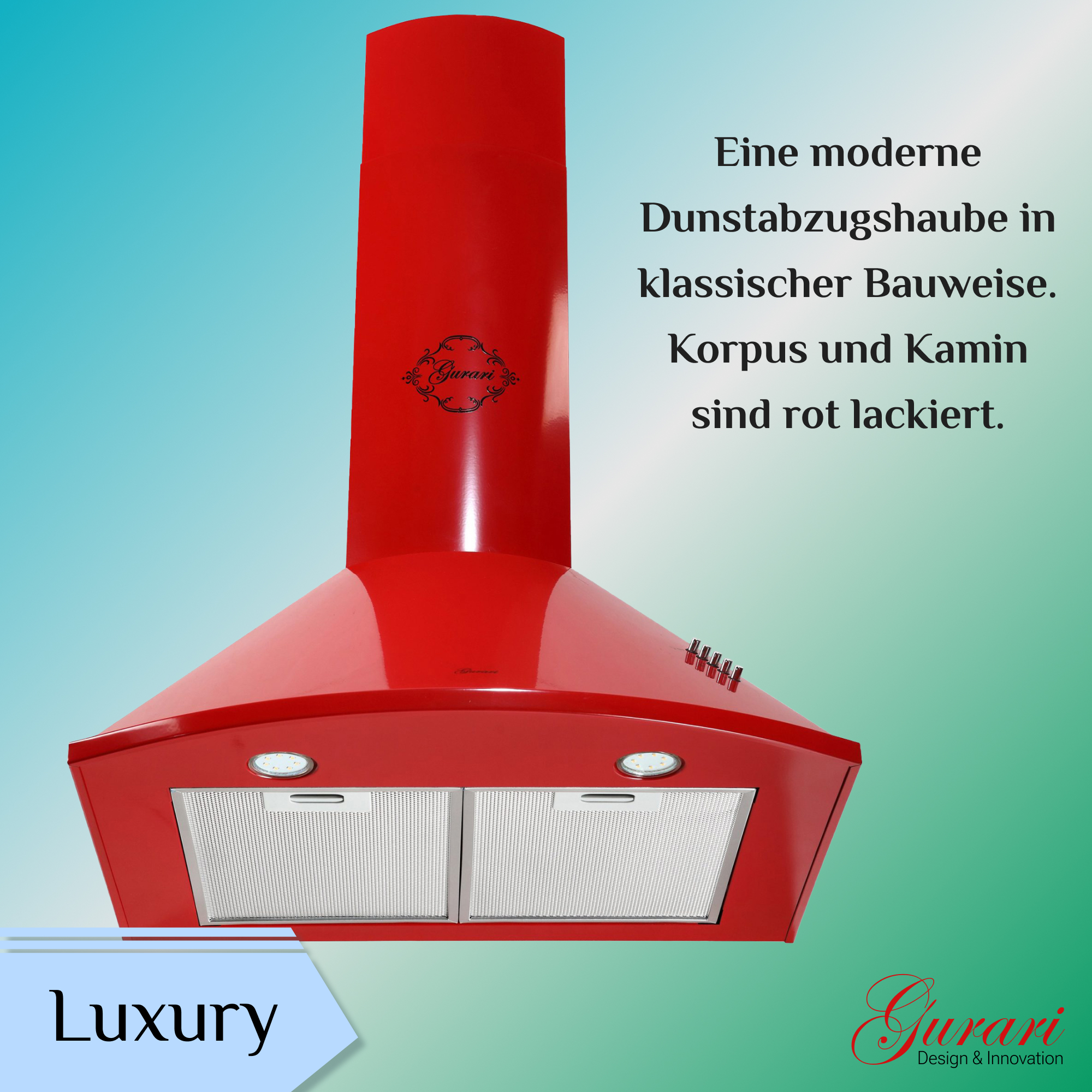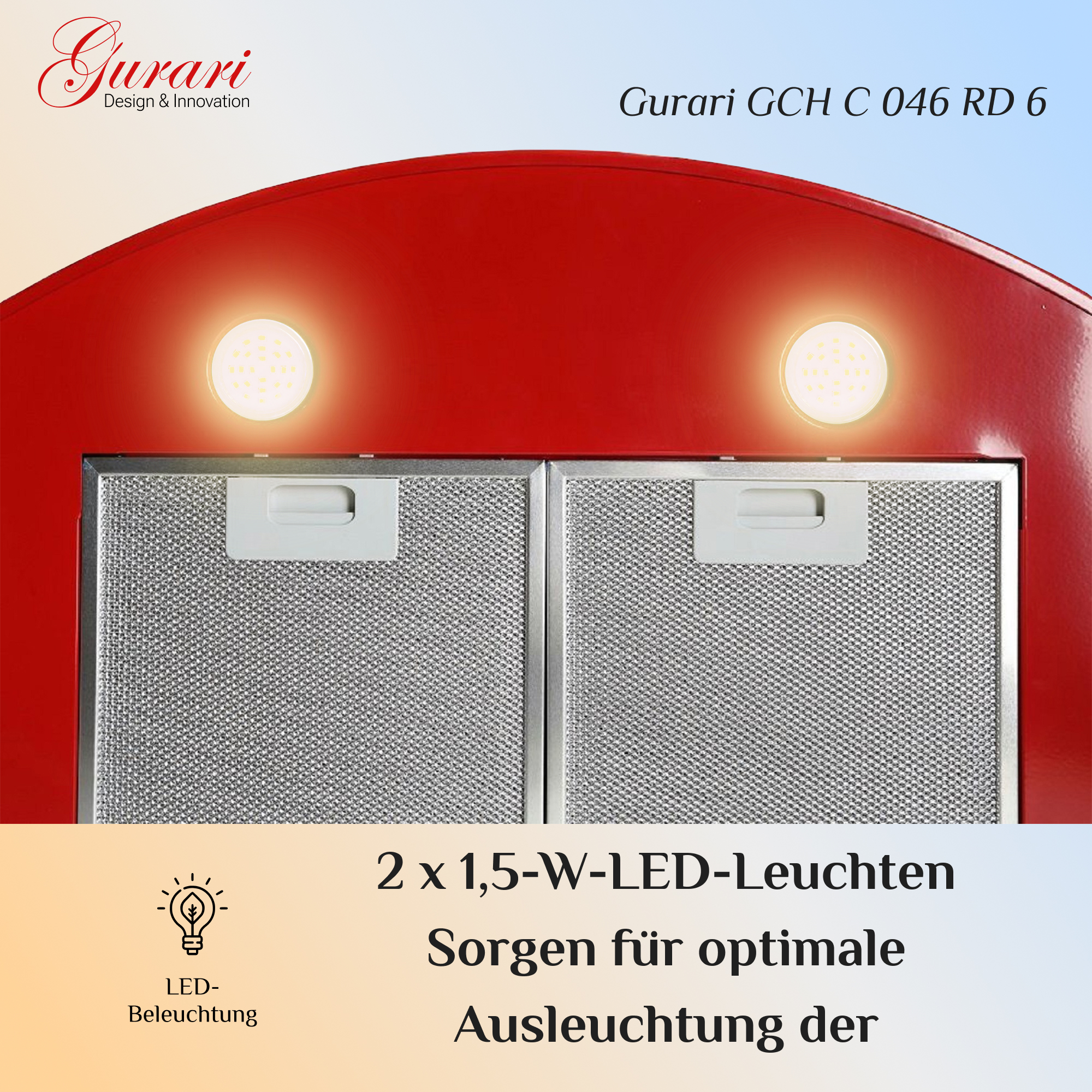 Das Modell GCH C 046 RD 6 N ist eine moderne Dunstabzugshaube in klassischer Bauweise. Korpus und Kamin sind rot lackiert.
