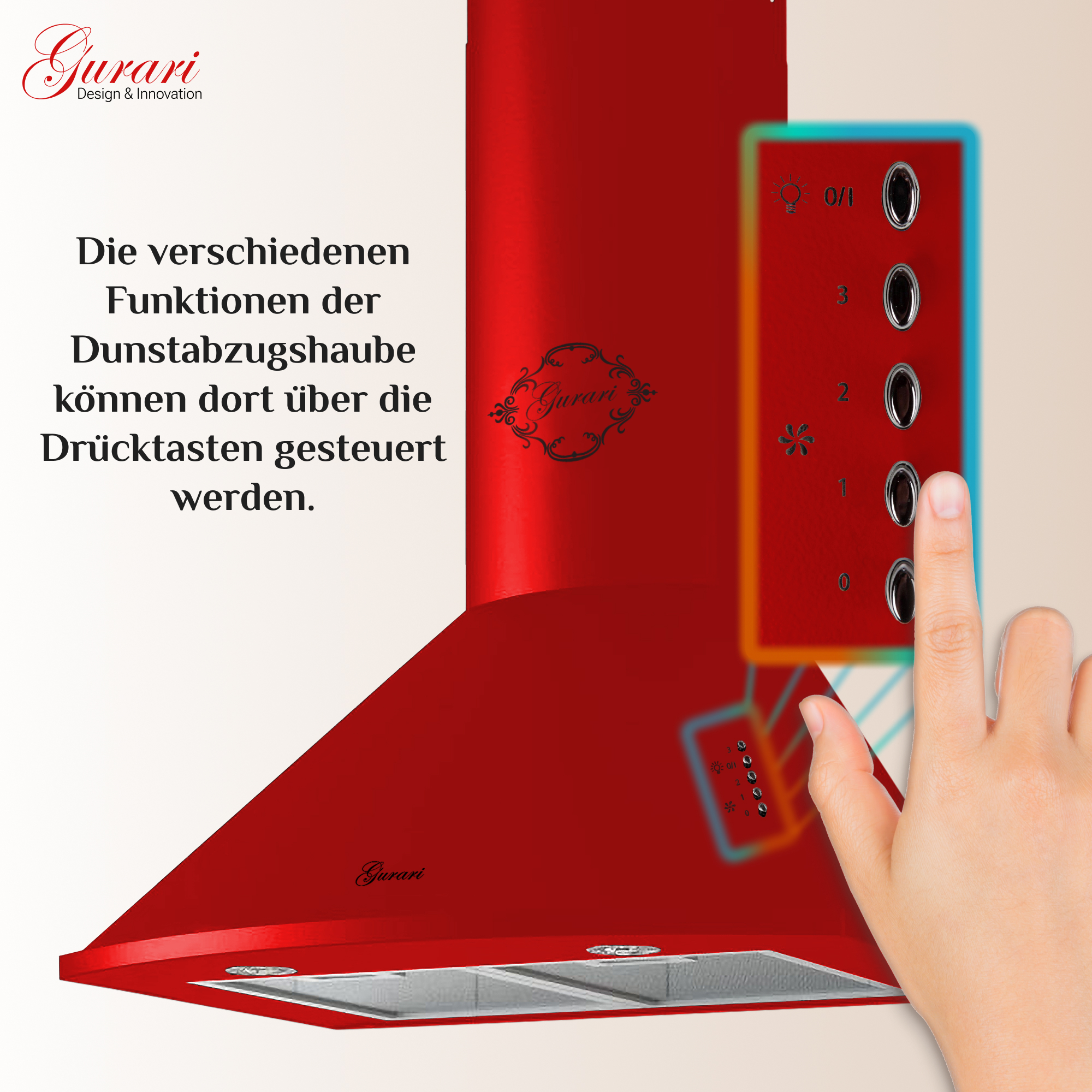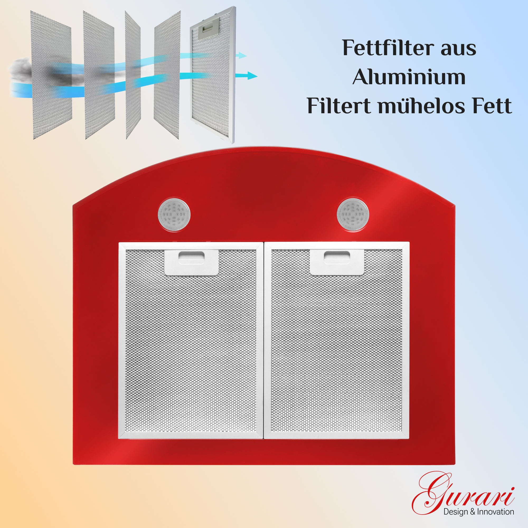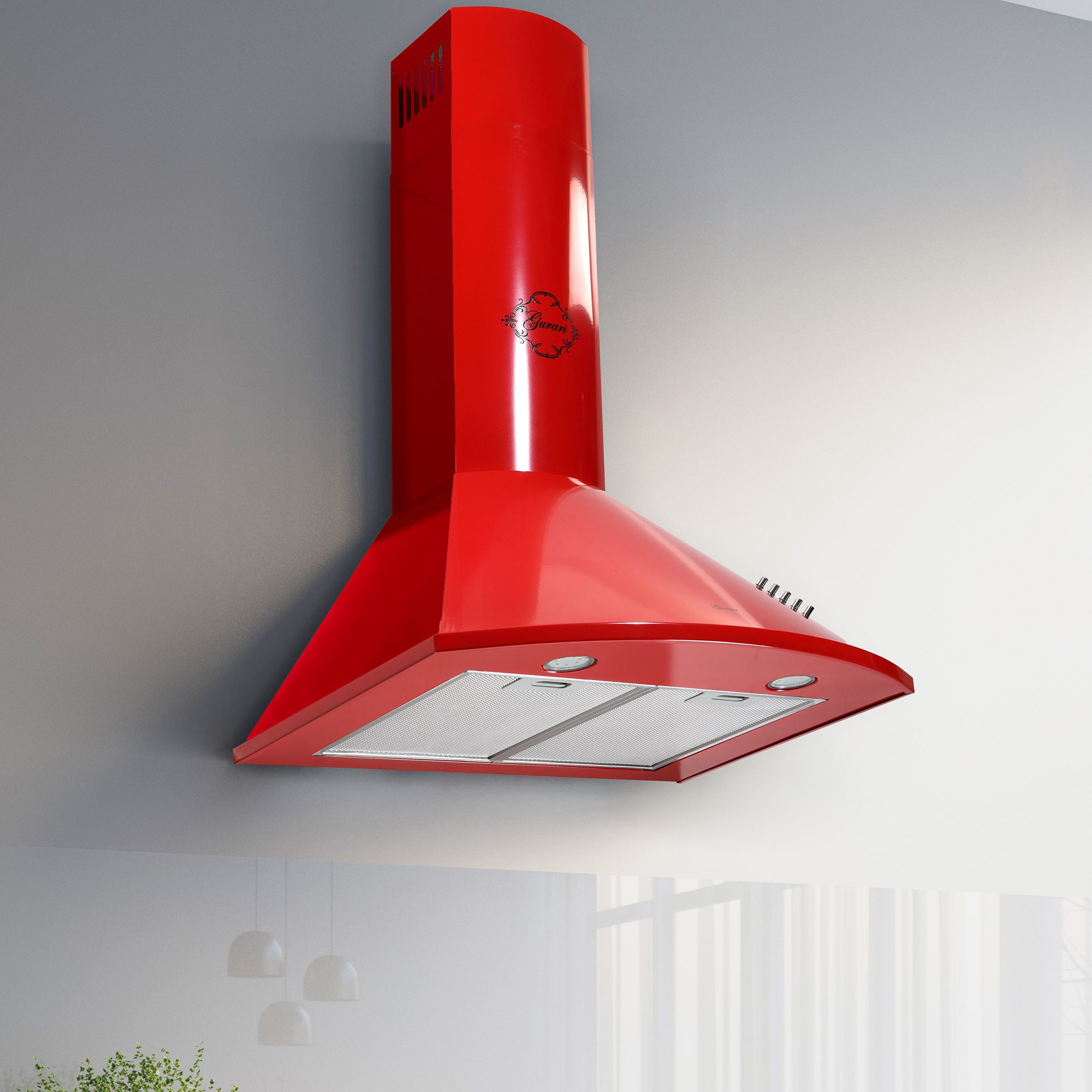 Das Modell GCH C 046 RD 6 N ist eine moderne Dunstabzugshaube in klassischer Bauweise. Korpus und Kamin sind rot lackiert.