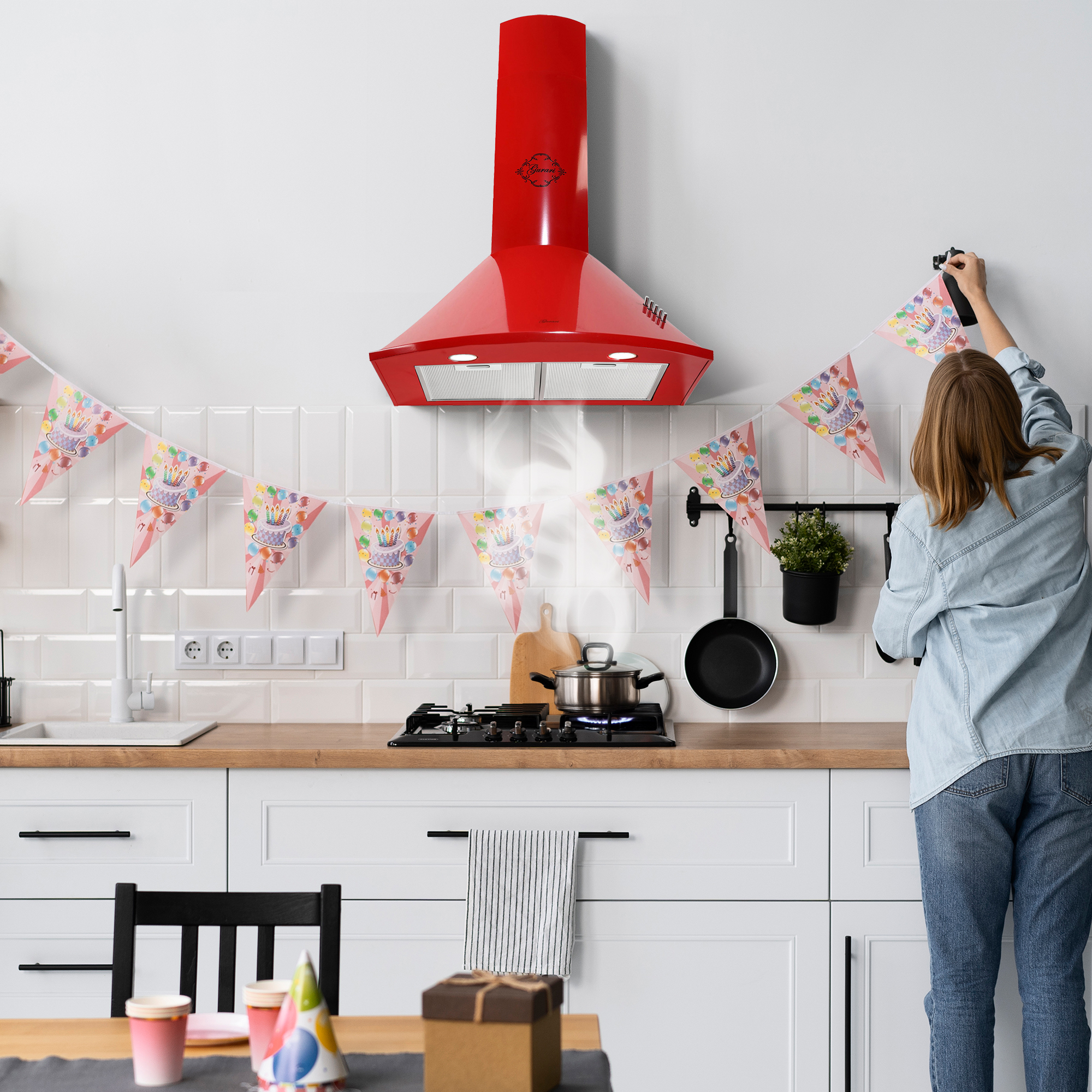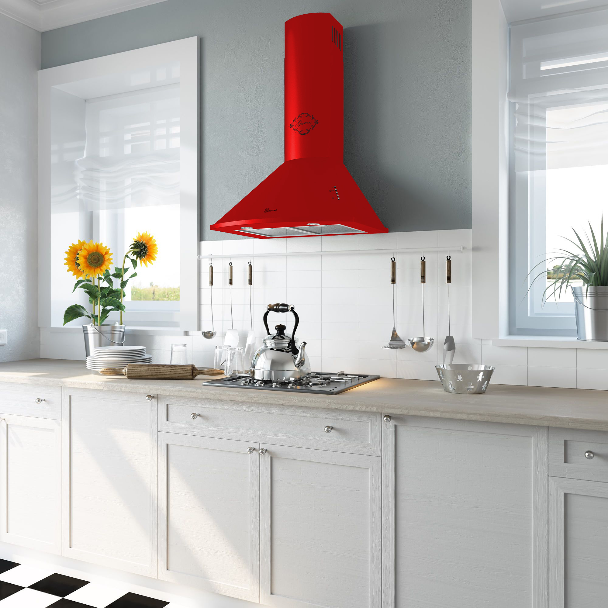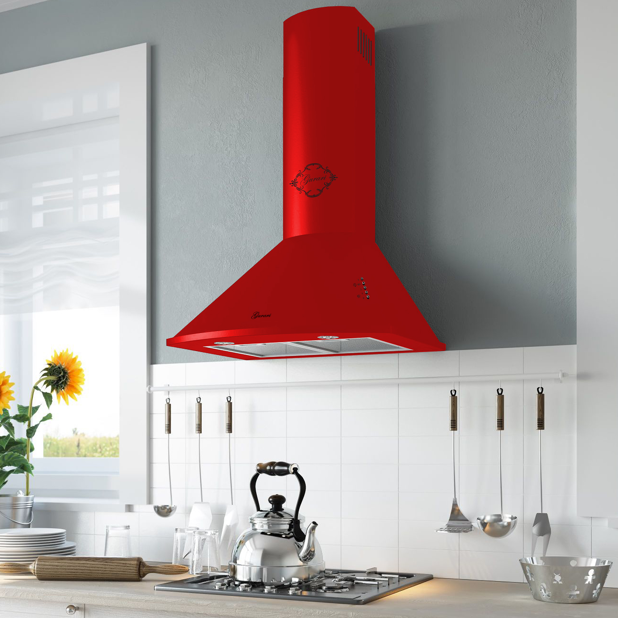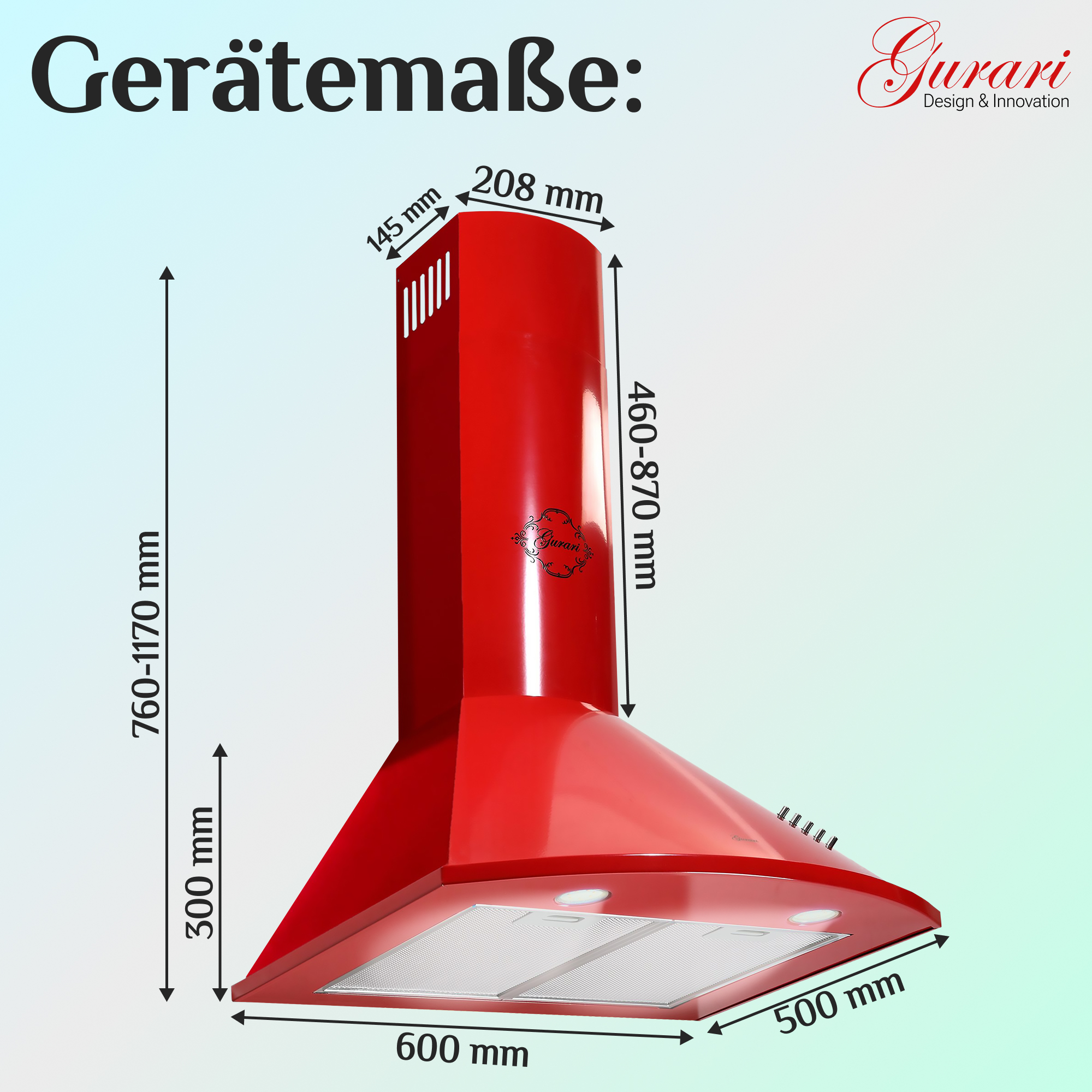Das Modell GCH C 046 RD 6 N ist eine moderne Dunstabzugshaube in klassischer Bauweise. Korpus und Kamin sind rot lackiert.
