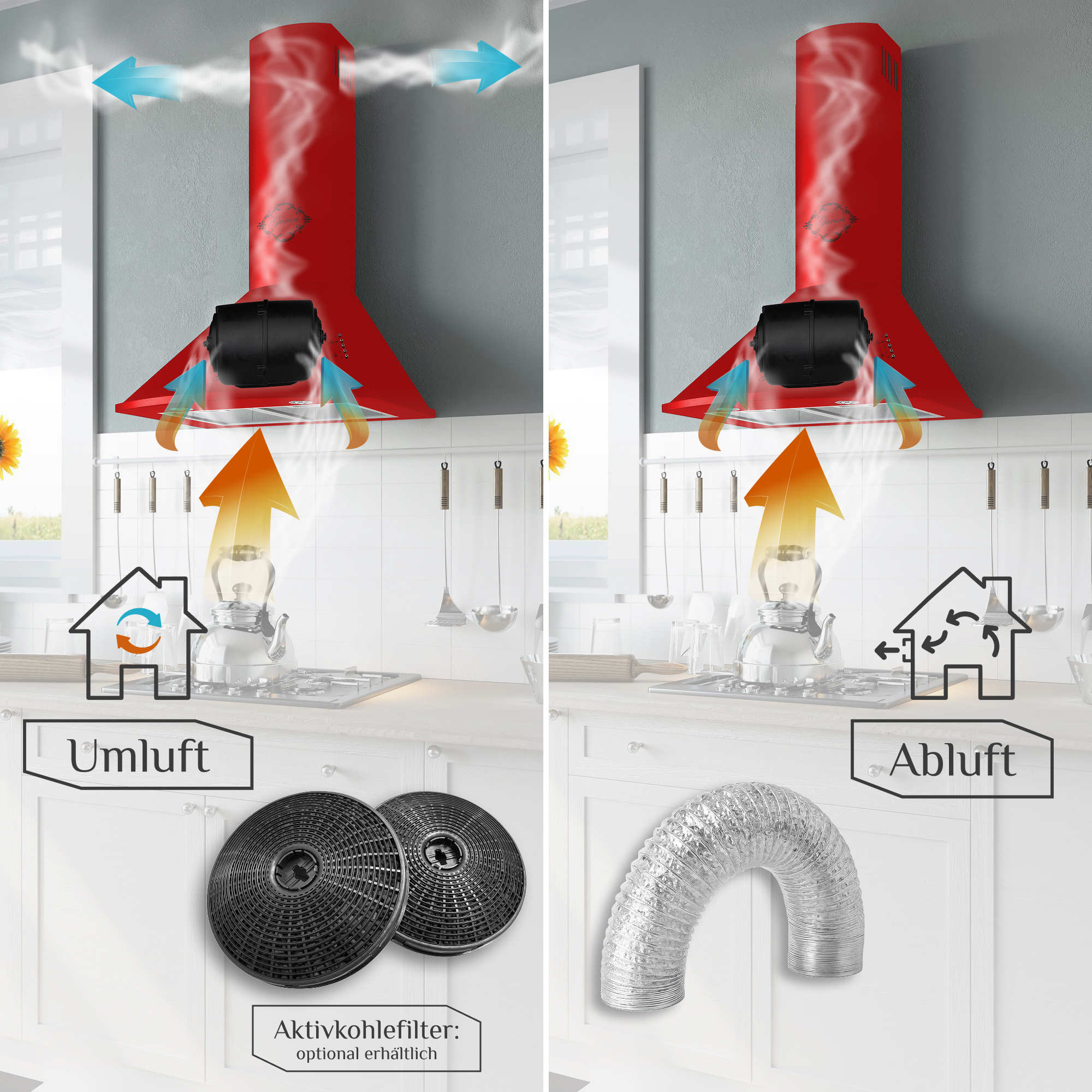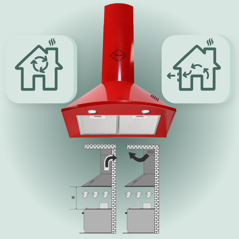 Je nach Bedarf kann diese Dunstabzugshaube im Abluft- oder Umluftbetrieb genutzt werden. Durch optional erhältliche Kohlefilter ist der Betrieb im Umluftmodus möglich.