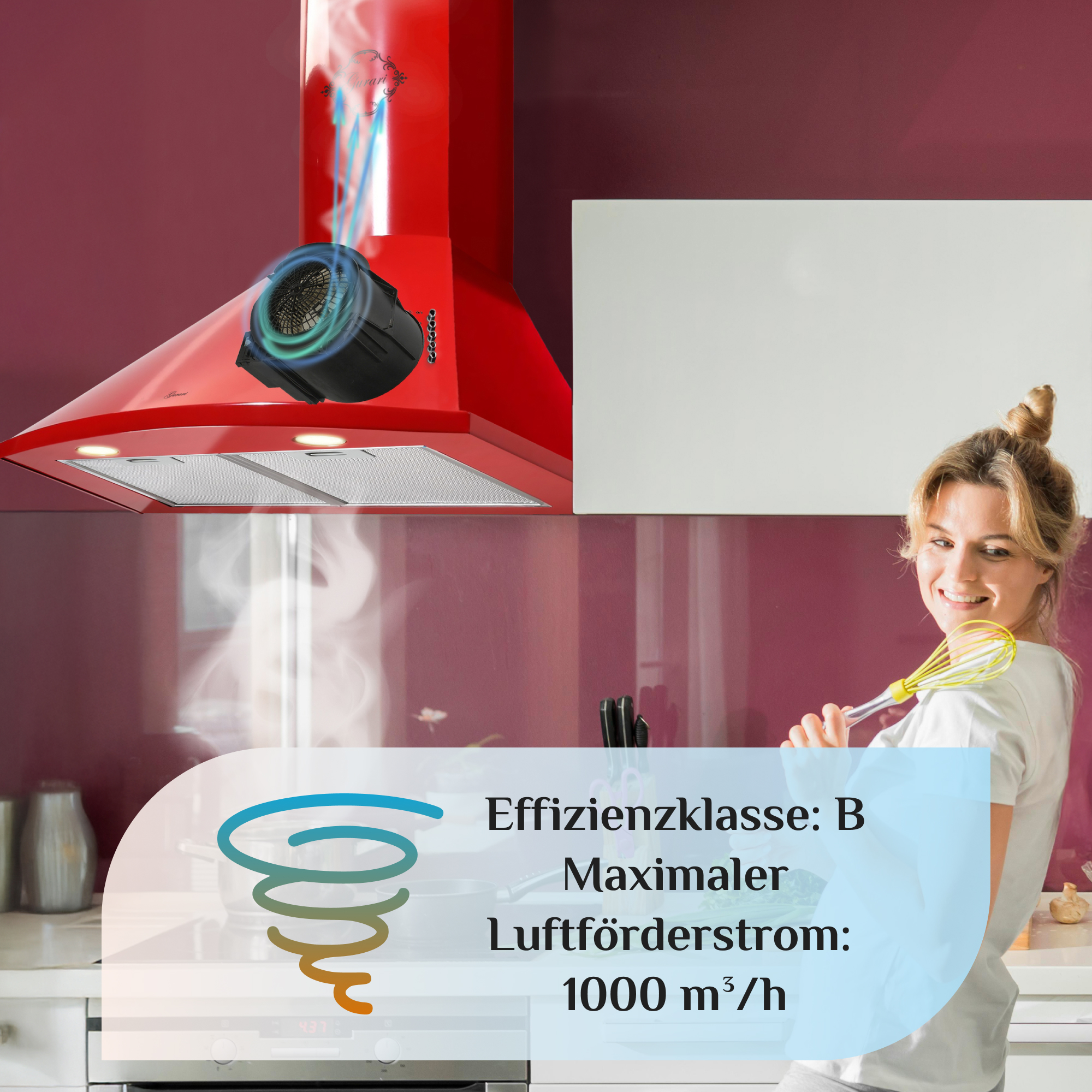 Für ausreichend Power sorgt ein bis zu 1000m³/h leistender Motor im Inneren der Dunstabzugshaube. Reguliert wird dieser über drei Leistungsstufen.