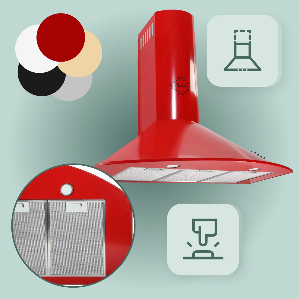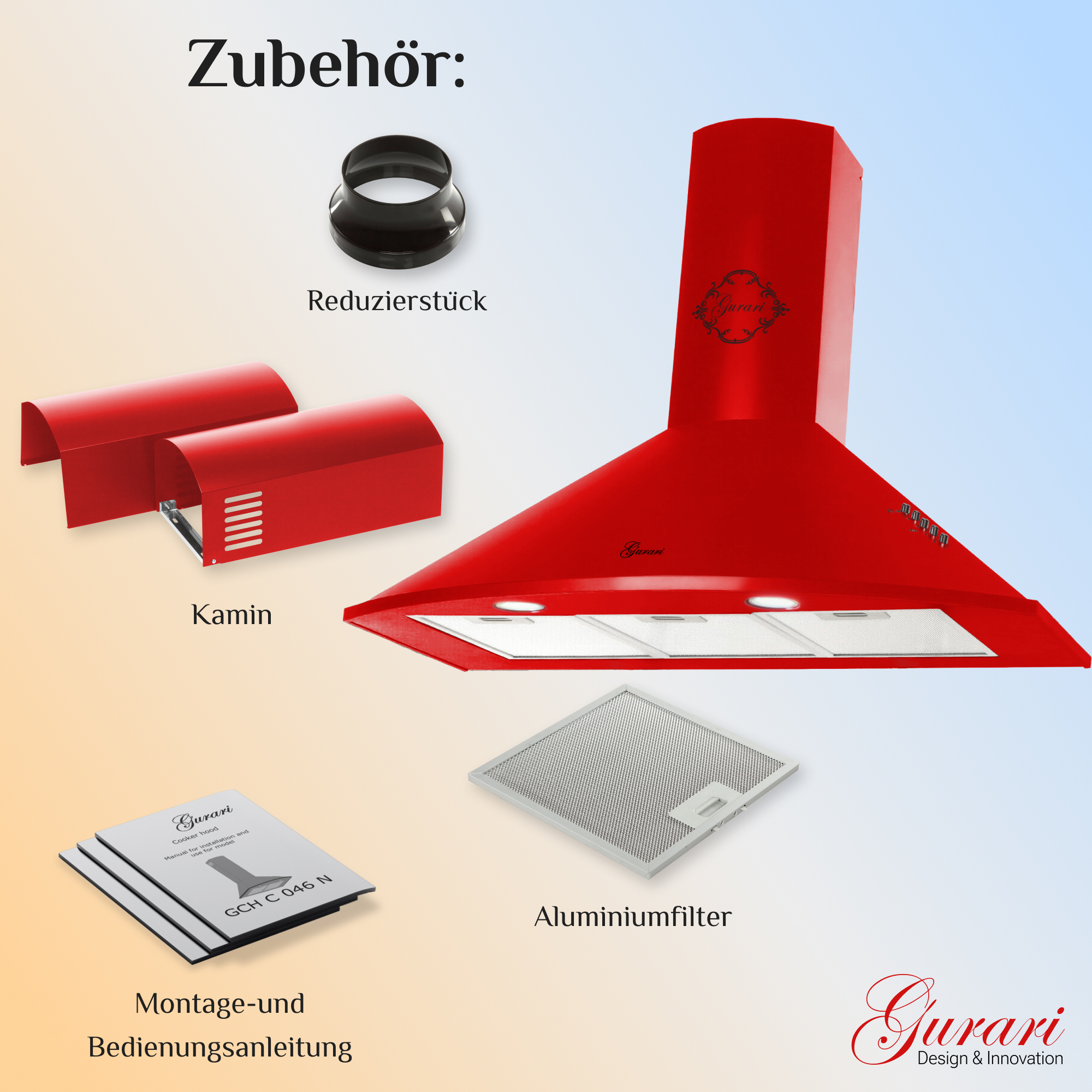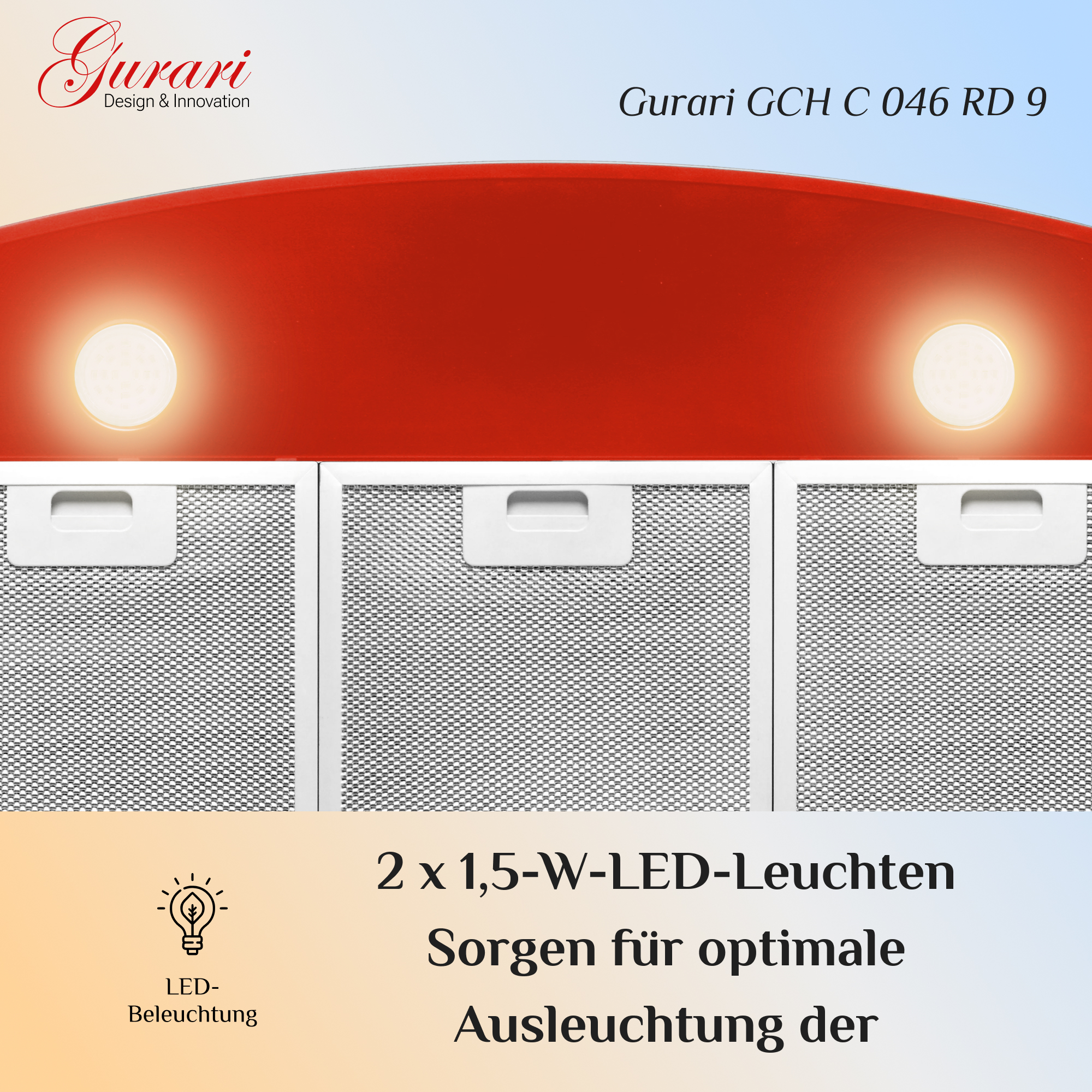 Das Modell GCH C 046 RD 9 N ist eine moderne Dunstabzugshaube in klassischer Bauweise. Korpus und Kamin sind rot lackiert.