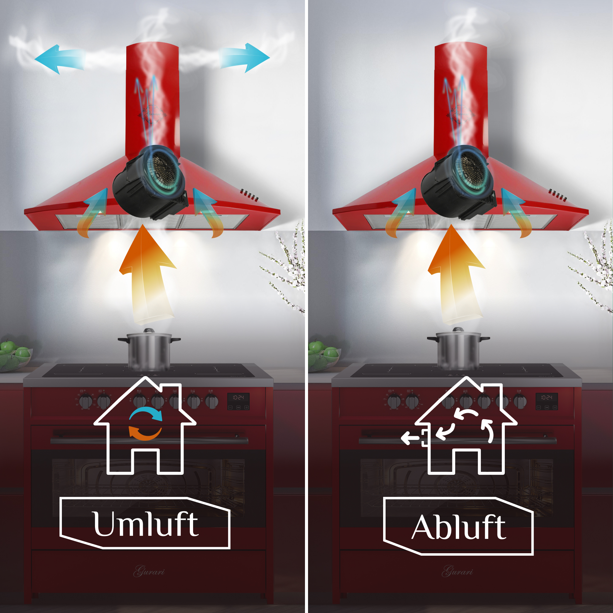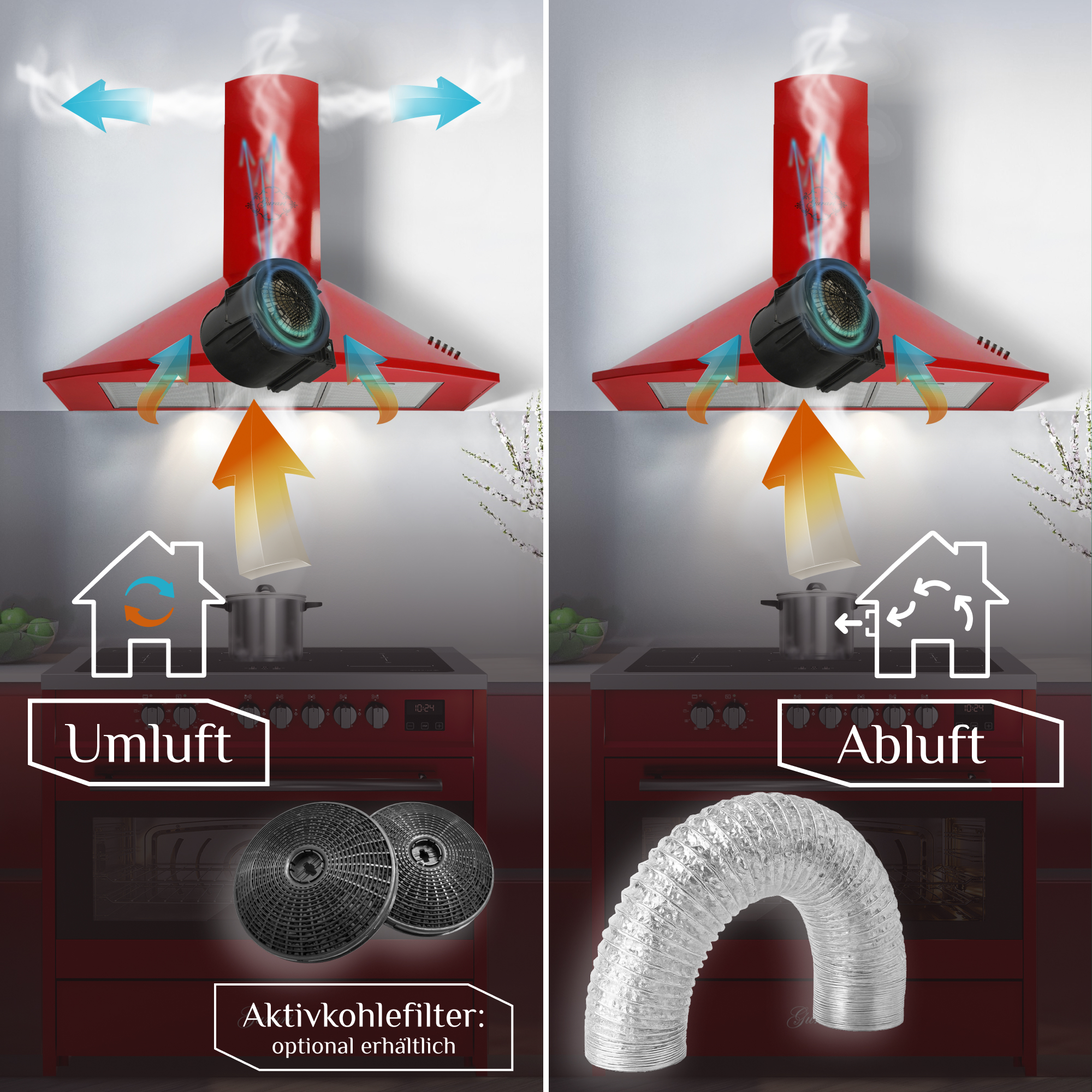 Je nach Bedarf kann diese Dunstabzugshaube im Abluft- oder Umluftbetrieb genutzt werden. Durch optional erhältliche Kohlefilter ist der Betrieb im Umluftmodus möglich.