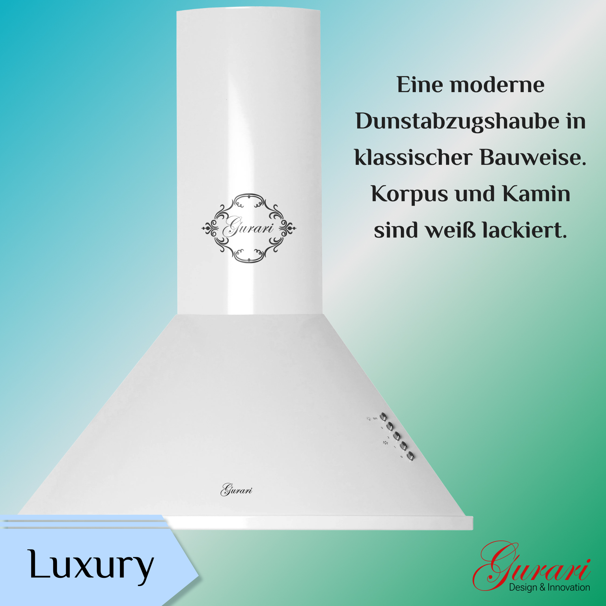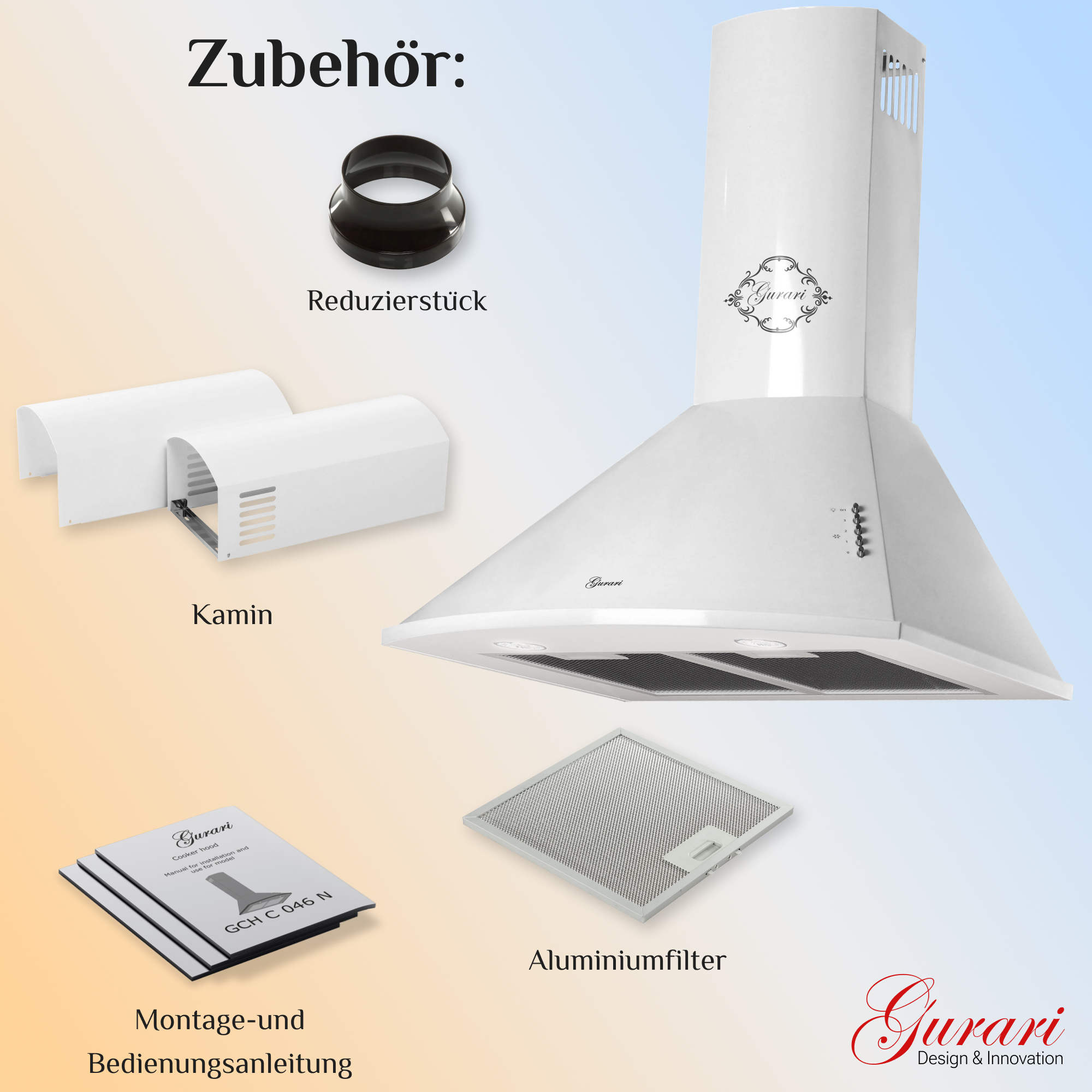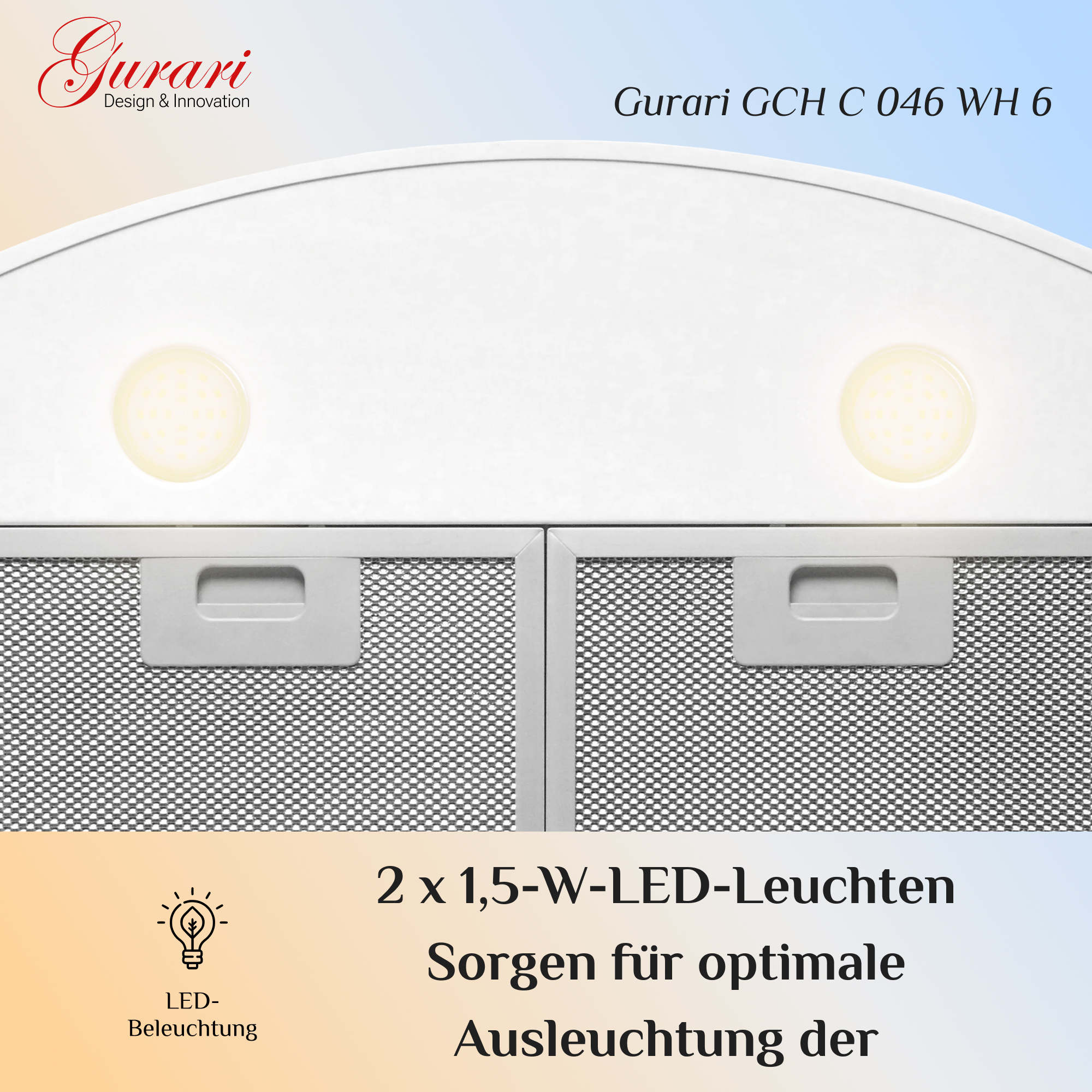 Das Modell GCH C 046 WH 6 N ist eine moderne Dunstabzugshaube in klassischer Bauweise. Korpus und Kamin sind weiß lackiert.