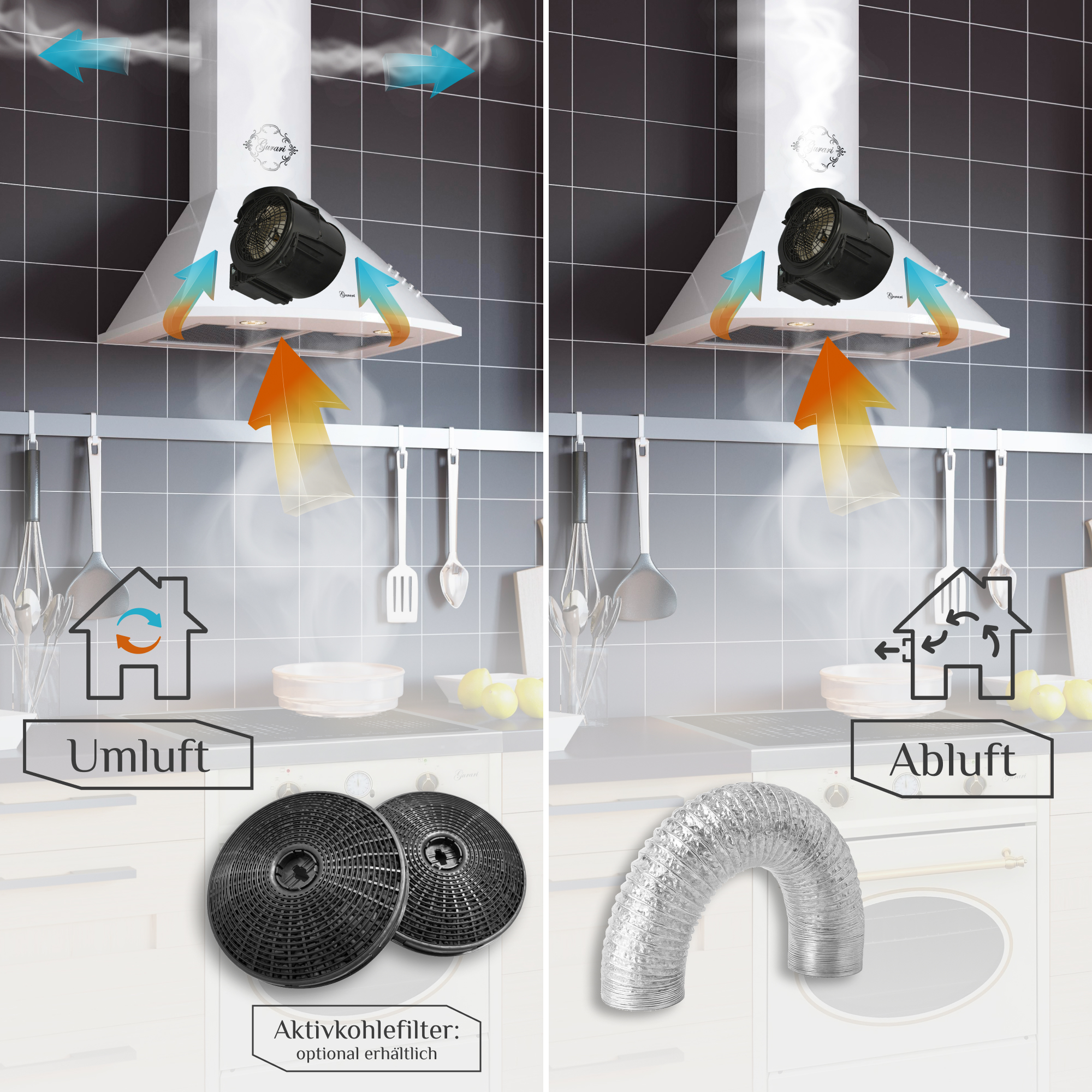 Je nach Bedarf kann diese Dunstabzugshaube im Abluft- oder Umluftbetrieb genutzt werden. Durch optional erhältliche Kohlefilter ist der Betrieb im Umluftmodus möglich.