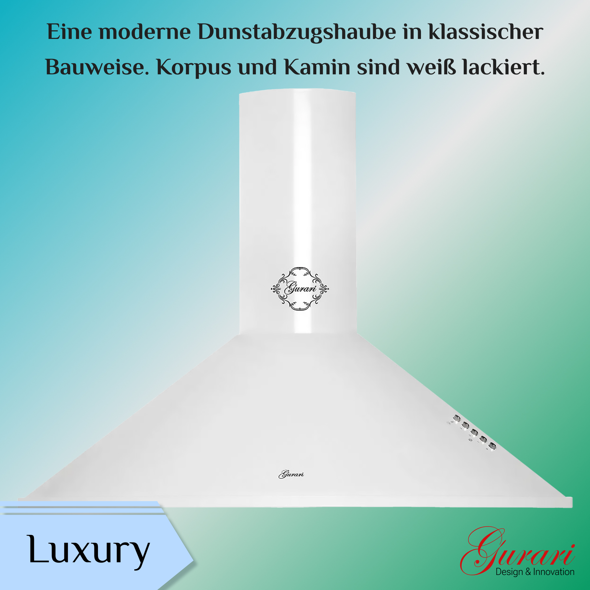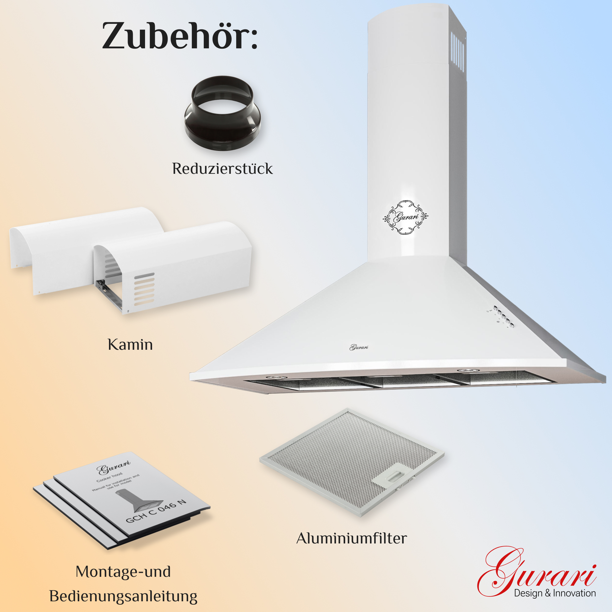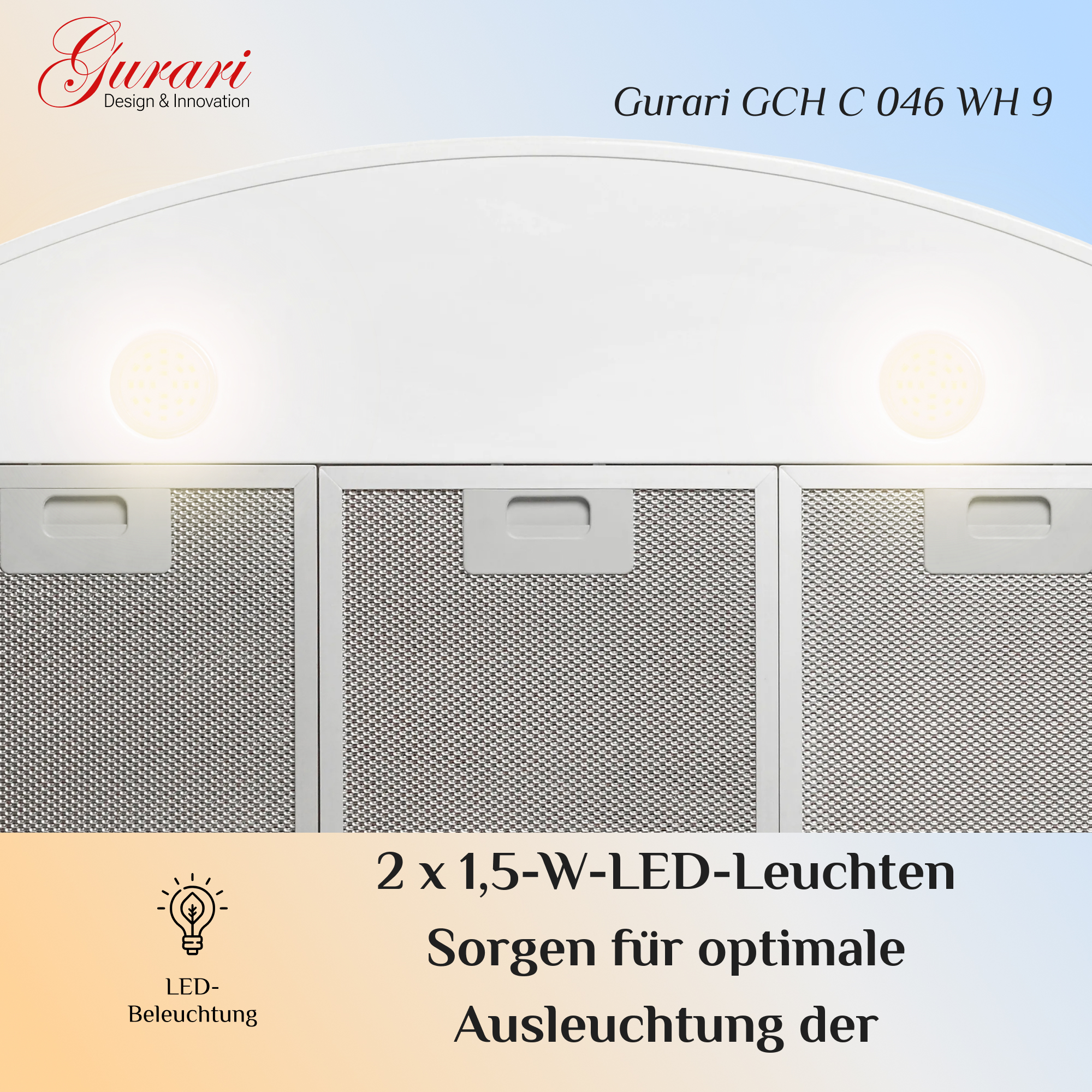 Das Modell GCH C 046 WH 9 N ist eine moderne Dunstabzugshaube in klassischer Bauweise. Korpus und Kamin sind weiß lackiert.