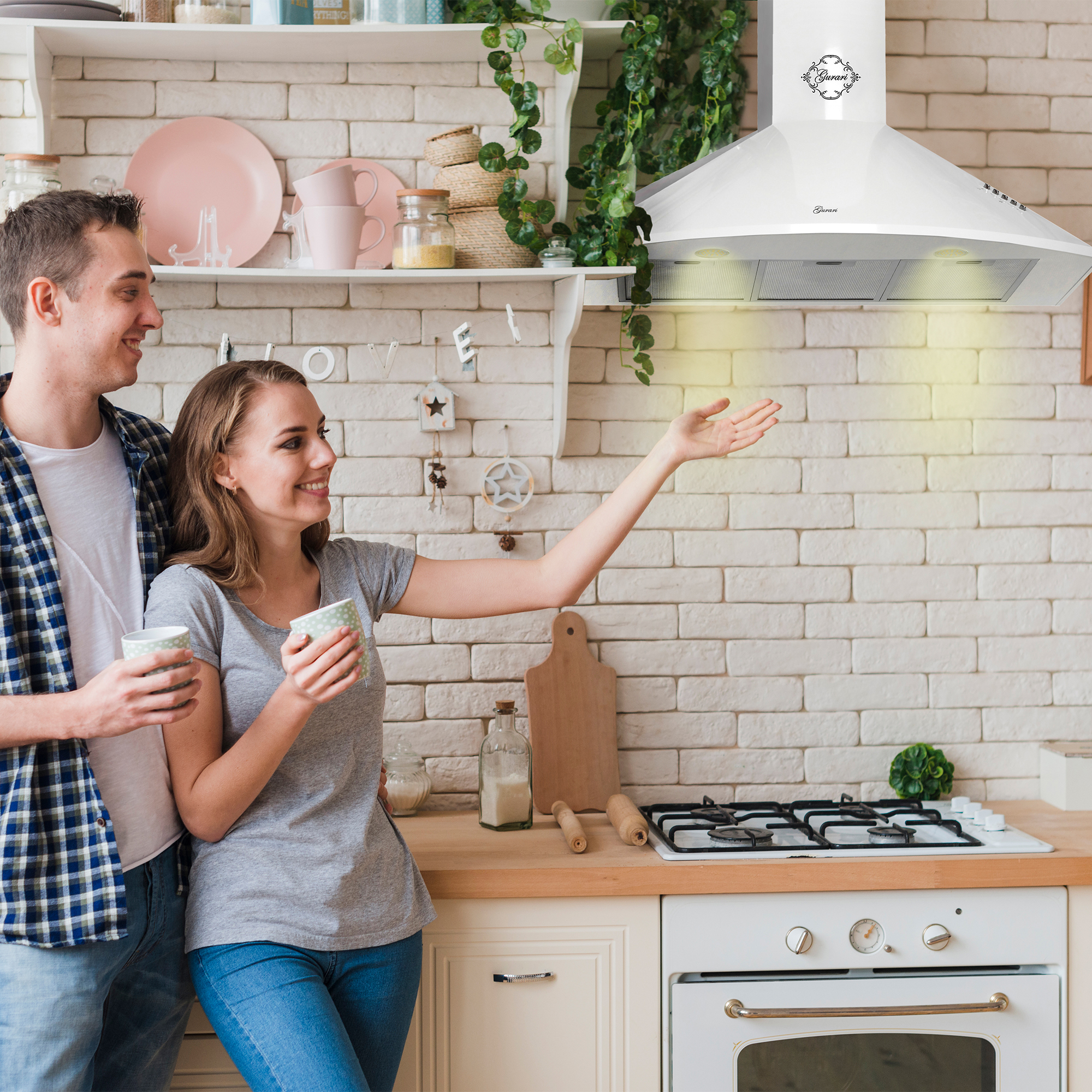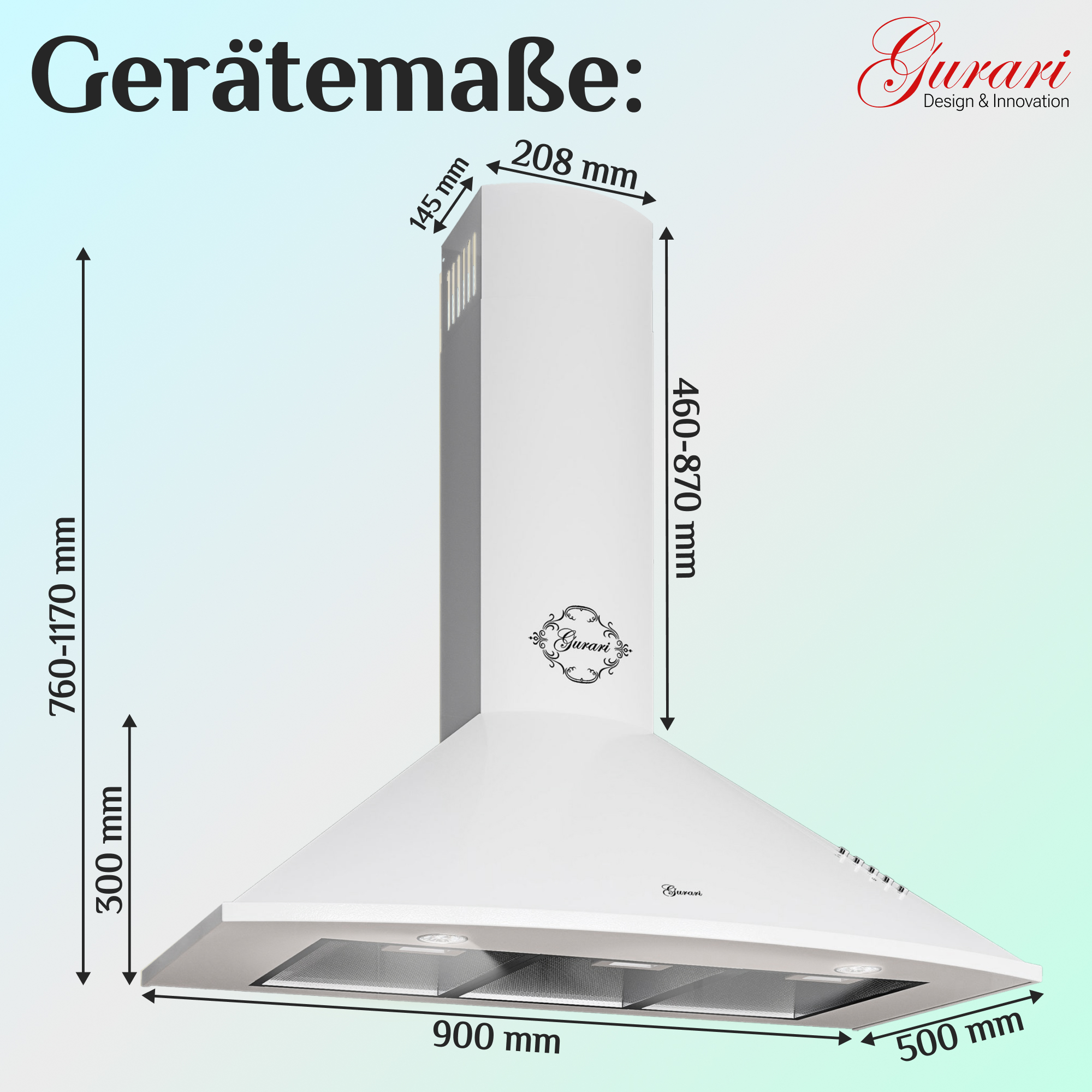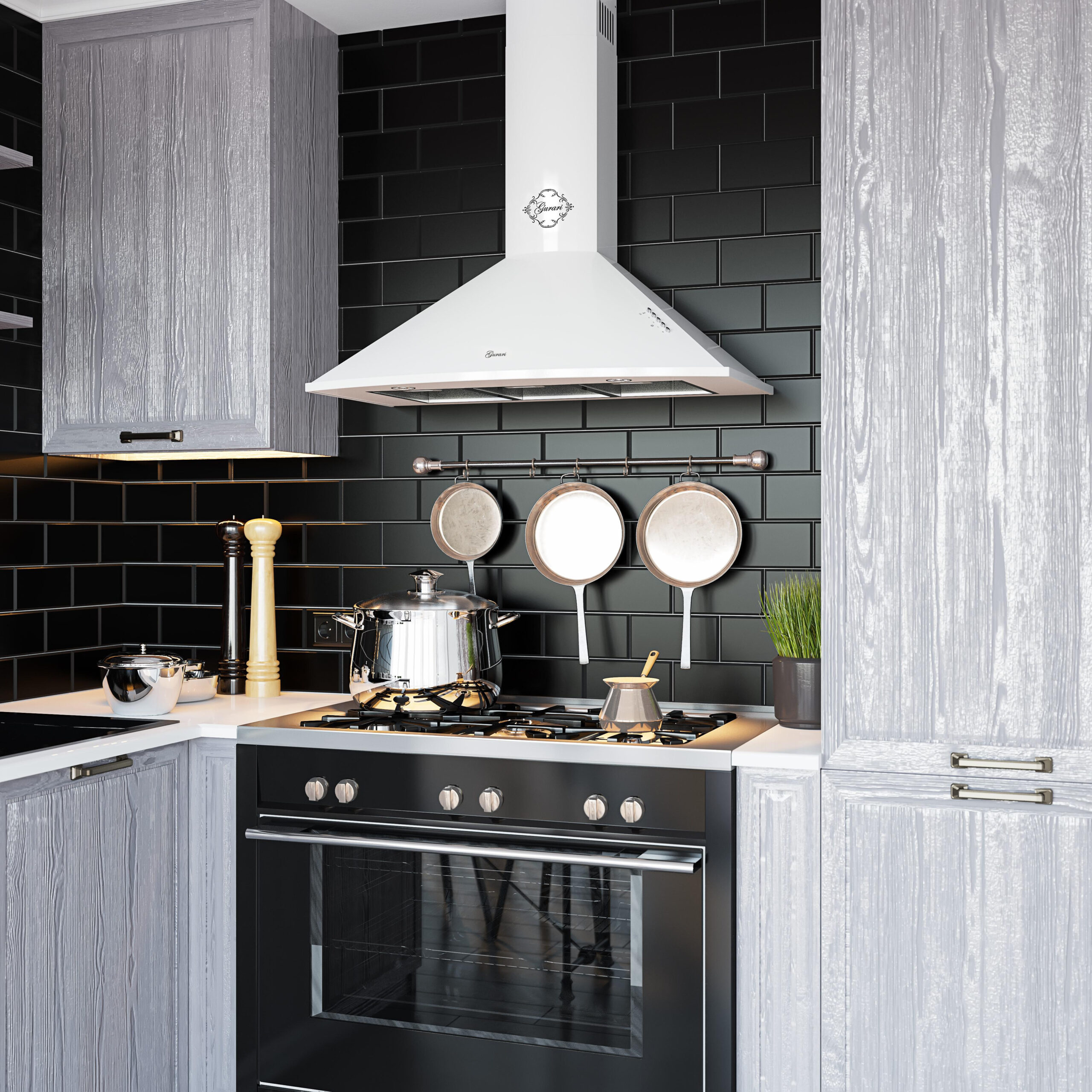 Das Modell GCH C 046 WH 9 N ist eine moderne Dunstabzugshaube in klassischer Bauweise. Korpus und Kamin sind weiß lackiert.