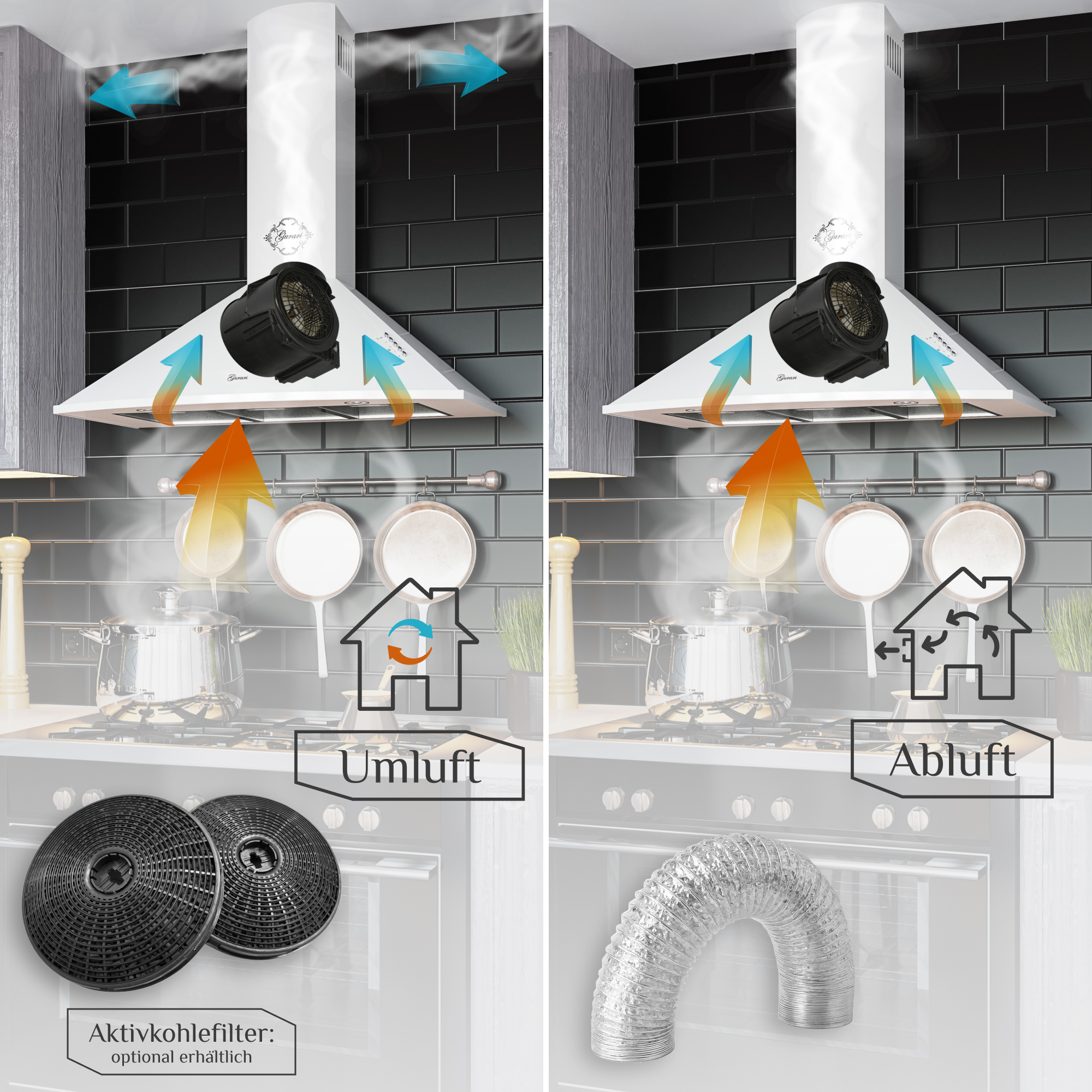 Je nach Bedarf kann diese Dunstabzugshaube im Abluft- oder Umluftbetrieb genutzt werden. Durch optional erhältliche Kohlefilter ist der Betrieb im Umluftmodus möglich.