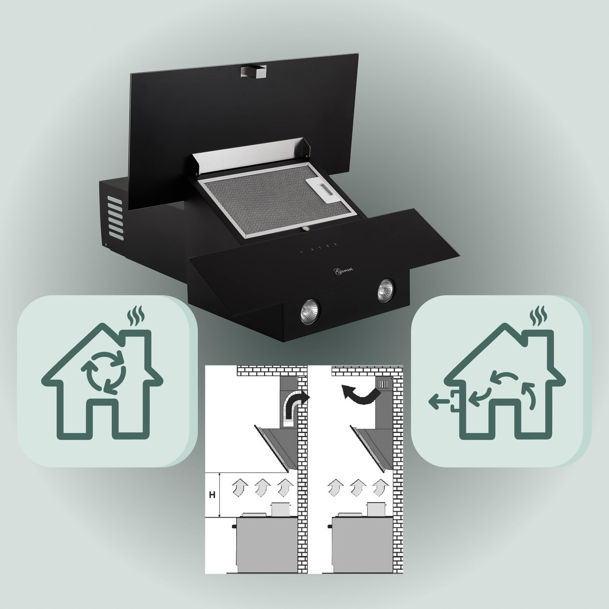 Je nach Bedarf kann diese Dunstabzugshaube im Abluft- oder Umluftbetrieb genutzt werden. Durch optional erhältliche Kohlefilter ist der Betrieb im Umluftmodus möglich.