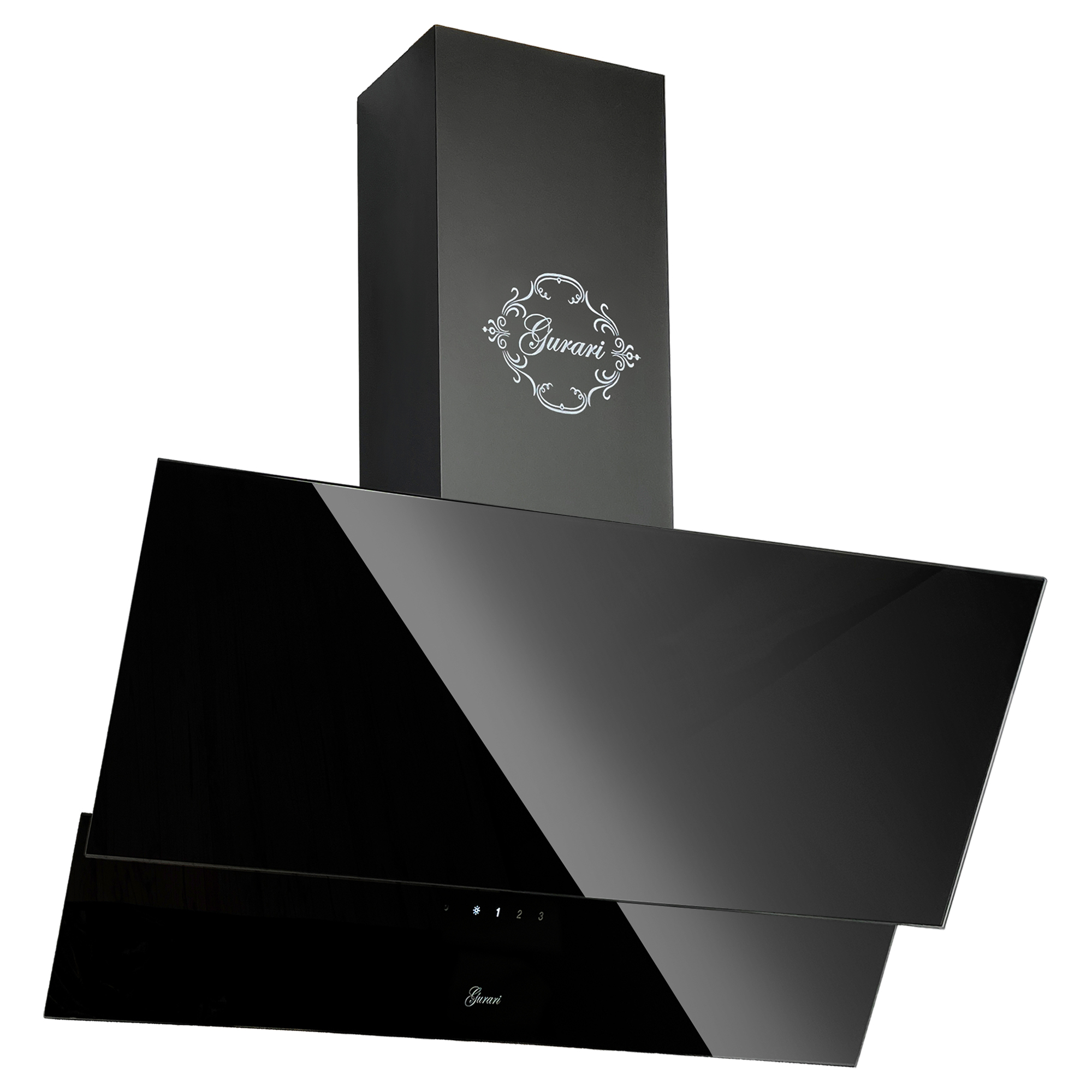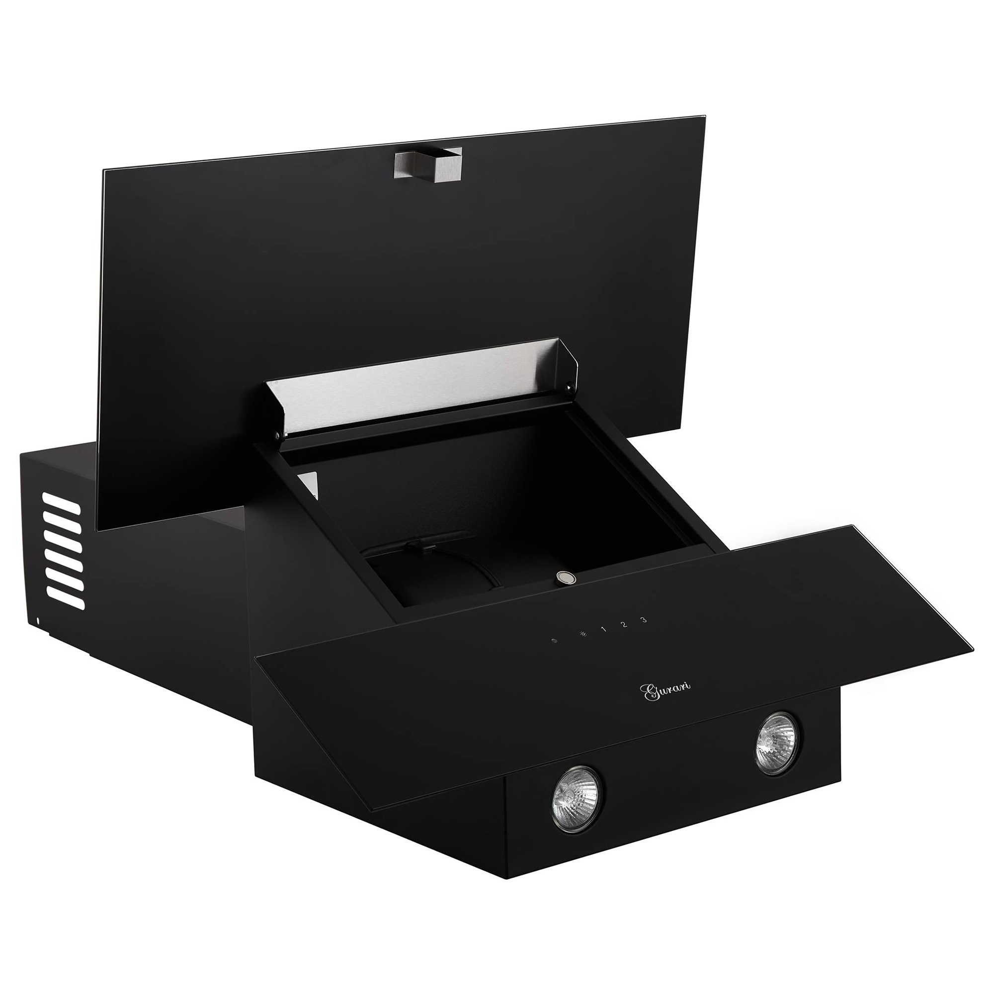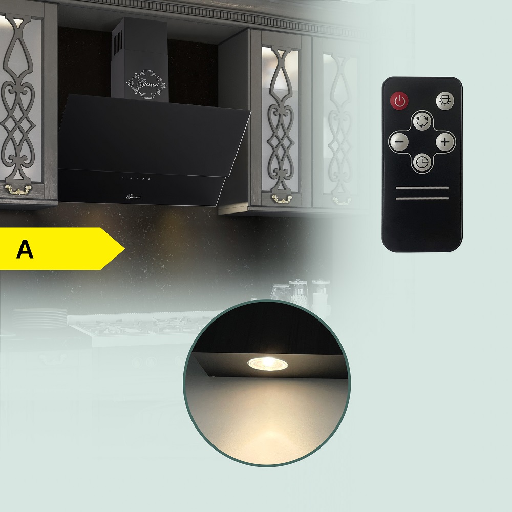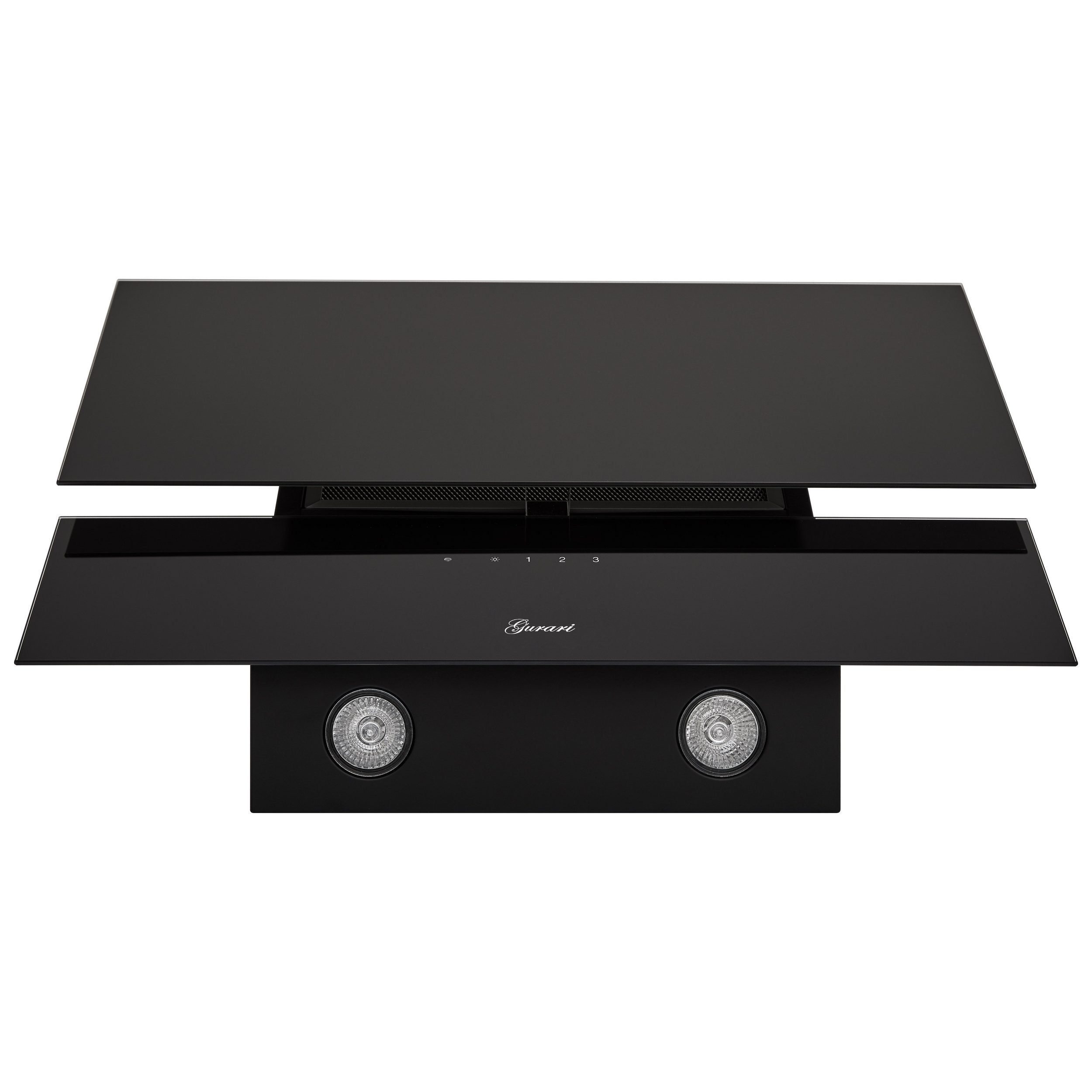 Das Modell GCH D 268 BL 6 PRIME N ist eine moderne Dunstabzugshaube in kopffreier Bauweise. Korpus und Kamin sind schwarz lackiert. Die Front besteht aus Schwarzglas und ist in zwei Teile unterteilt