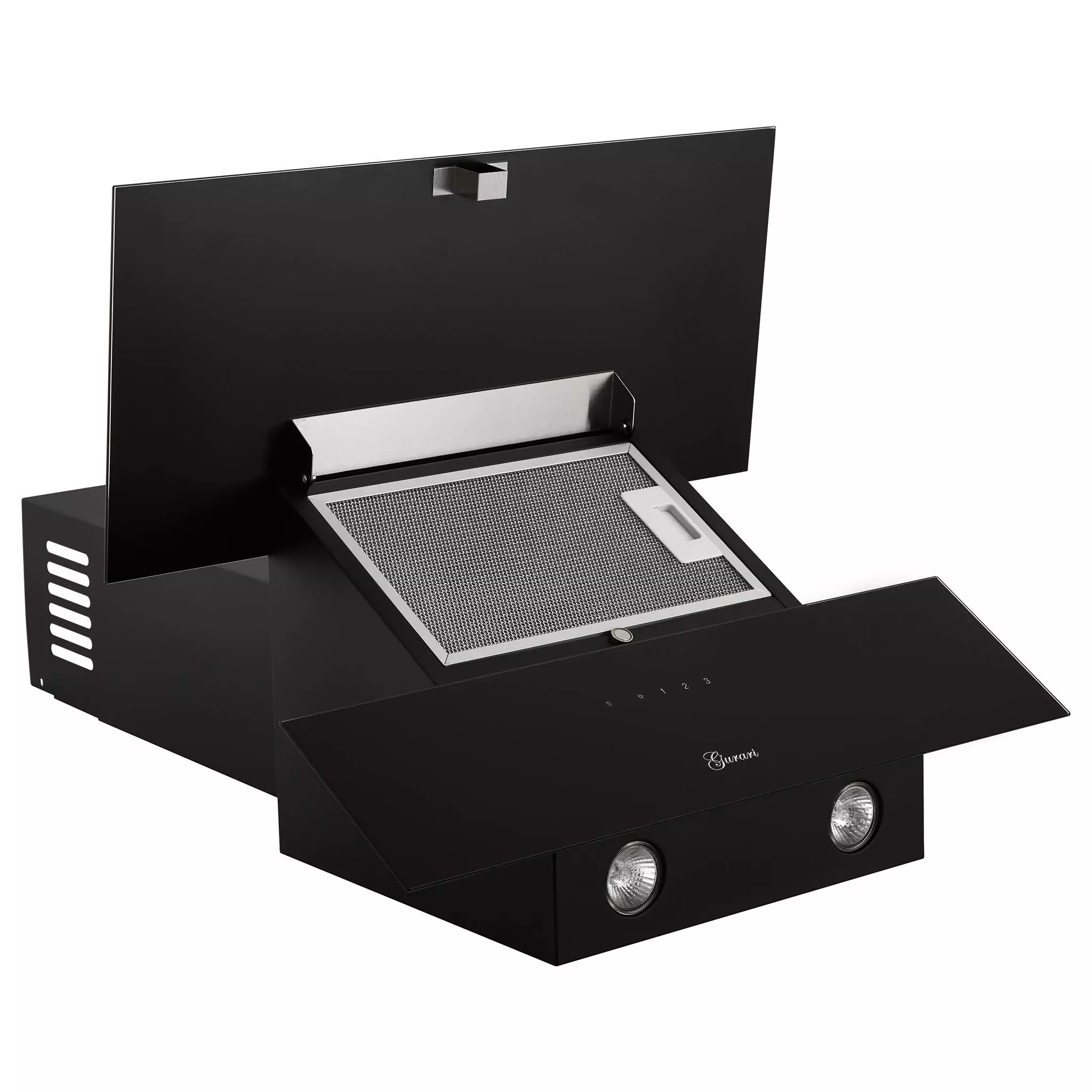 Im unteren Teil ist eine Sensorsteuerung integriert. Die verschiedenen Funktionen der Dunstabzugshaube können dort über die “Touch Control” oder die im Lieferumfang enthaltene Fernbedienung gesteuert werden.