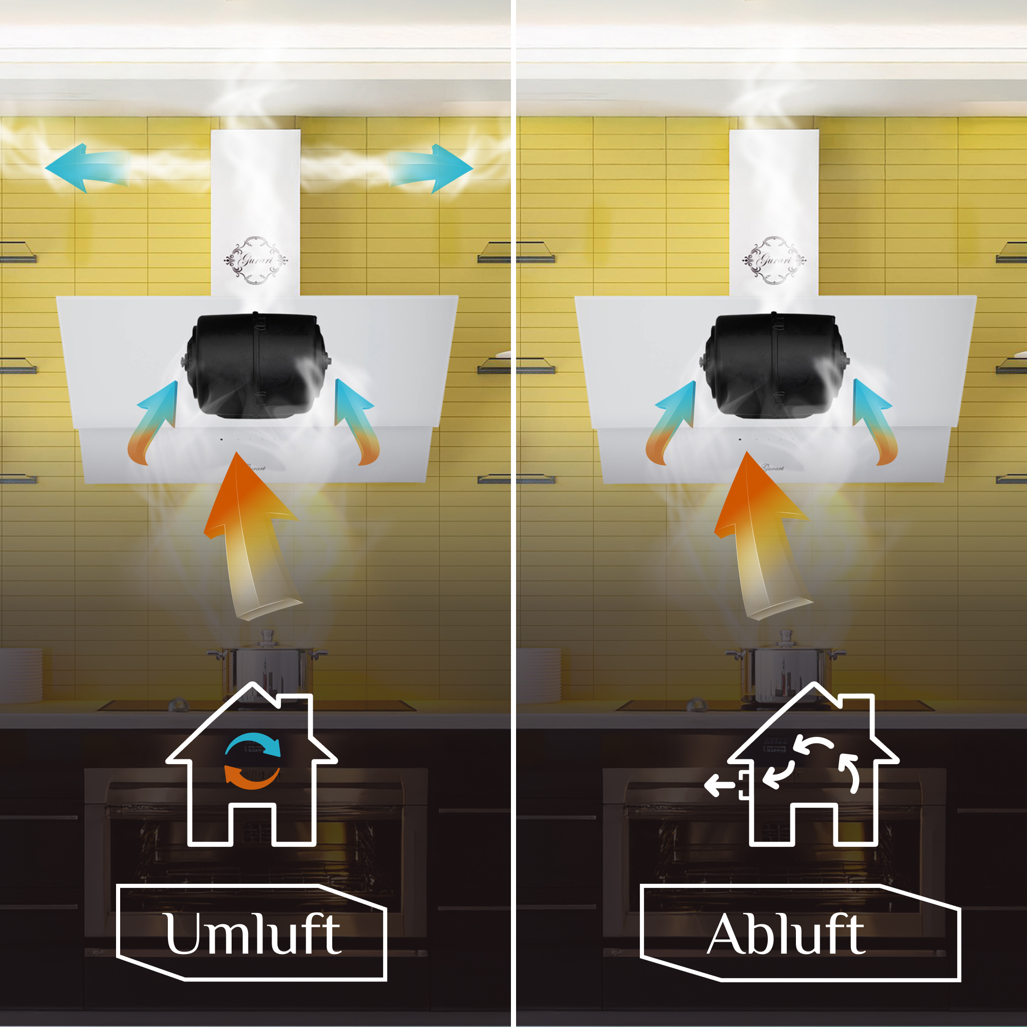 Je nach Bedarf kann diese Dunstabzugshaube im Abluft- oder Umluftbetrieb genutzt werden. Durch optional erhältliche Kohlefilter ist der Betrieb im Umluftmodus möglich.