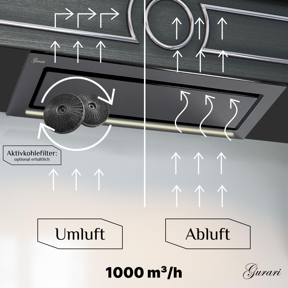 Für ausreichend Power sorgt ein bis zu 1000m³/h leistender Motor im Inneren der Dunstabzugshaube. Reguliert wird dieser über drei Leistungsstufen.