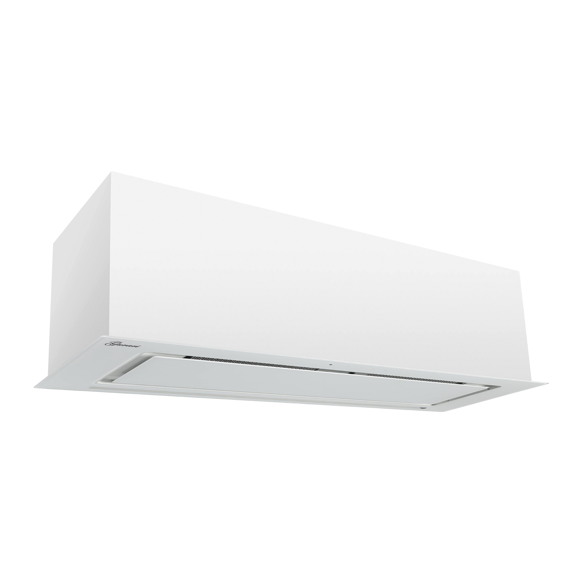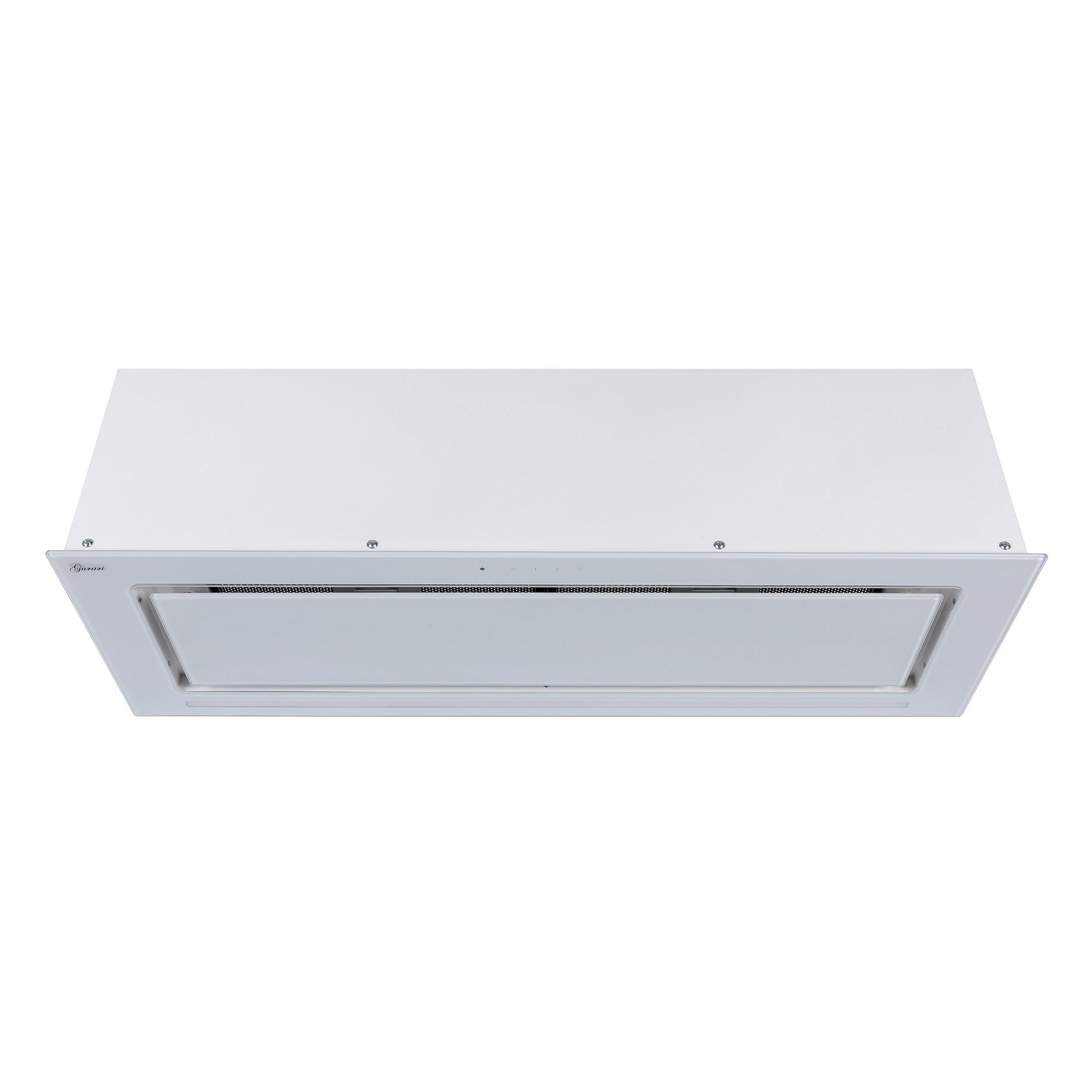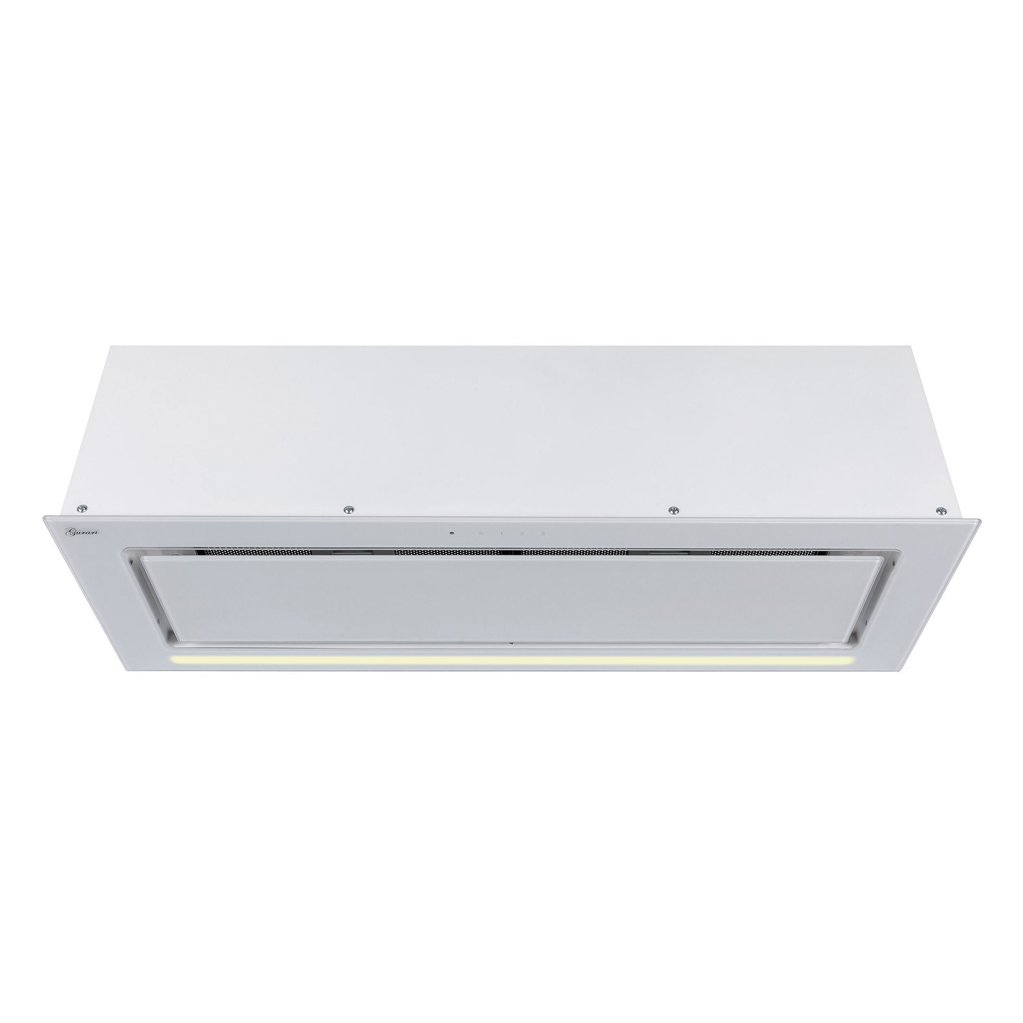 Rahmen und Innenplatte sind in Weiß Glas gehalten. Ein 6 Watt LED Streifen sorgt für optimale Beleuchtung der Kochfläche. Im äußeren Rahmen ist das Bedienfeld eingearbeitet. Die verschiedenen Funktionen der Dunstabzugshaube (Licht, Stufenregulierung und Timer) können dort über die “Touch Control” Steuerung oder die im Lieferumfang enthaltene Fernbedienung gesteuert werden.