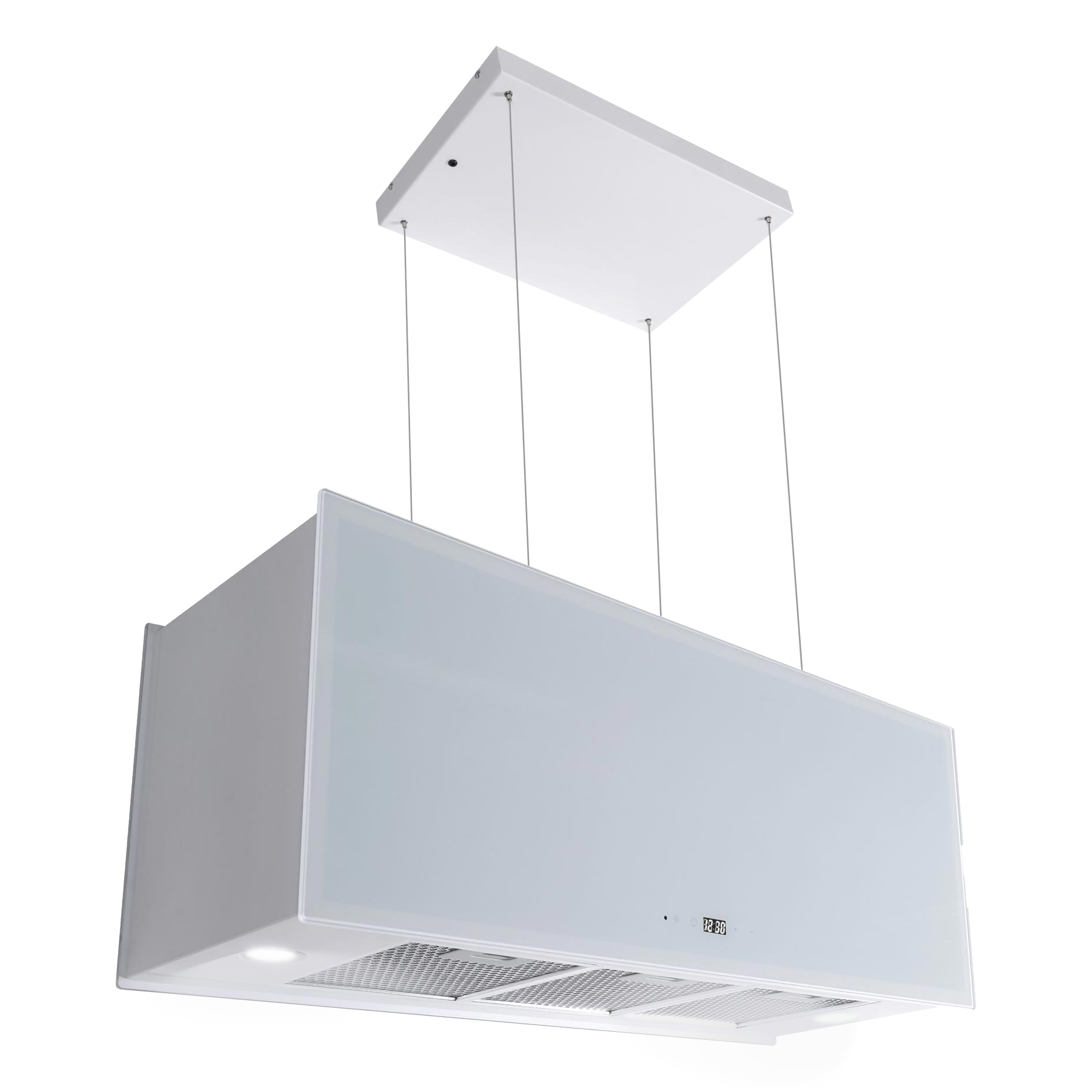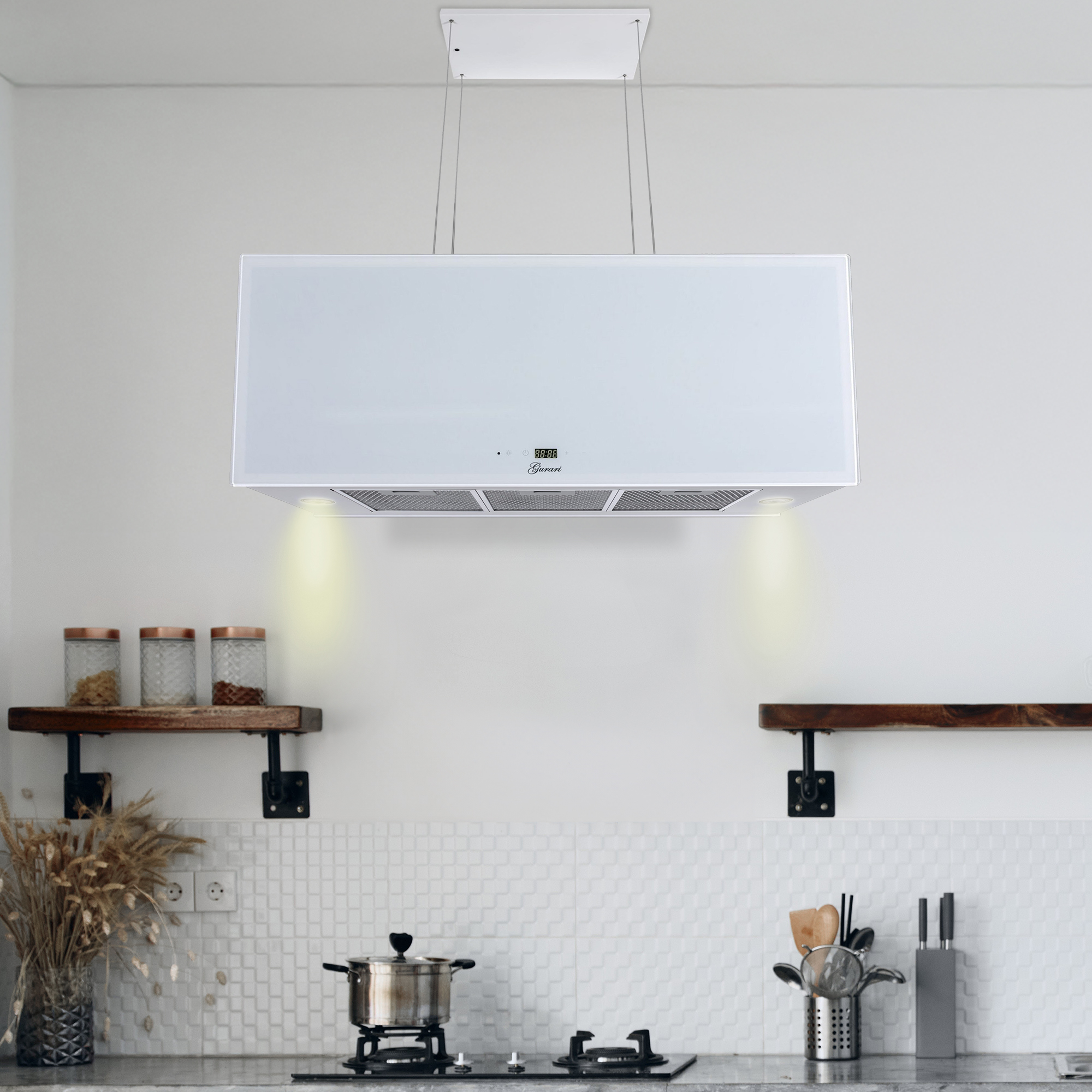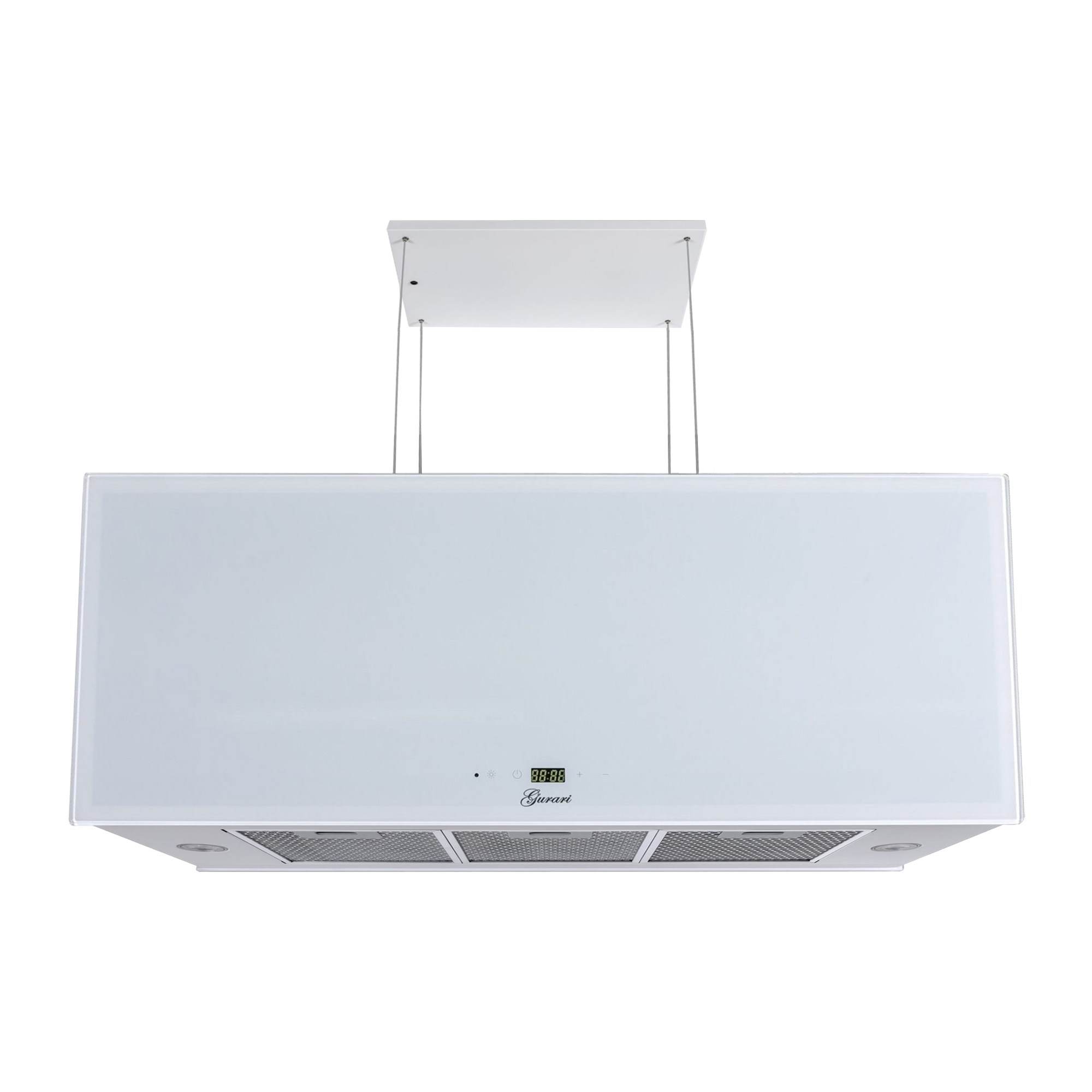 Die an 4 Seilen abgehängte Umluft Inselhaube GCH I 333 90 WH PRIME N ist komplett in Weiß gehalten. Auf der Vorderseite befindet sich eine 4-stufige (+ Turbo) “Touch Control” Steuerung.
