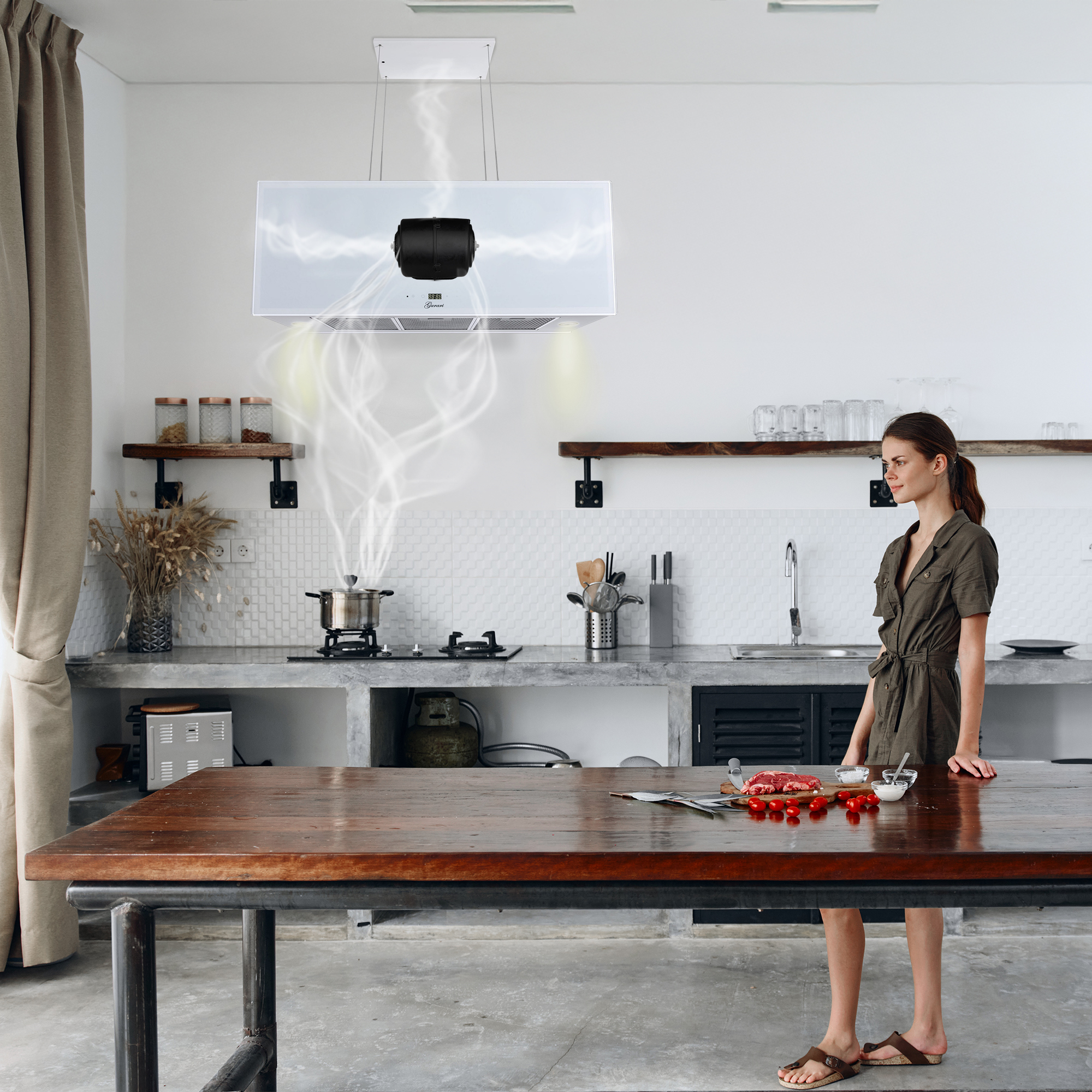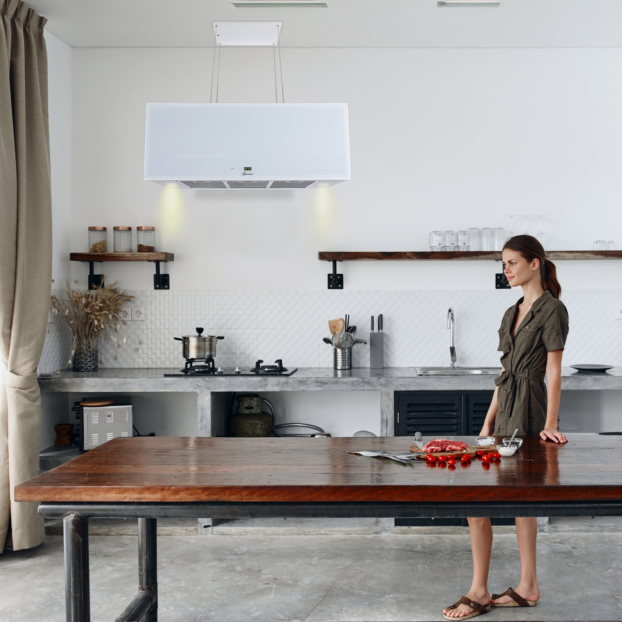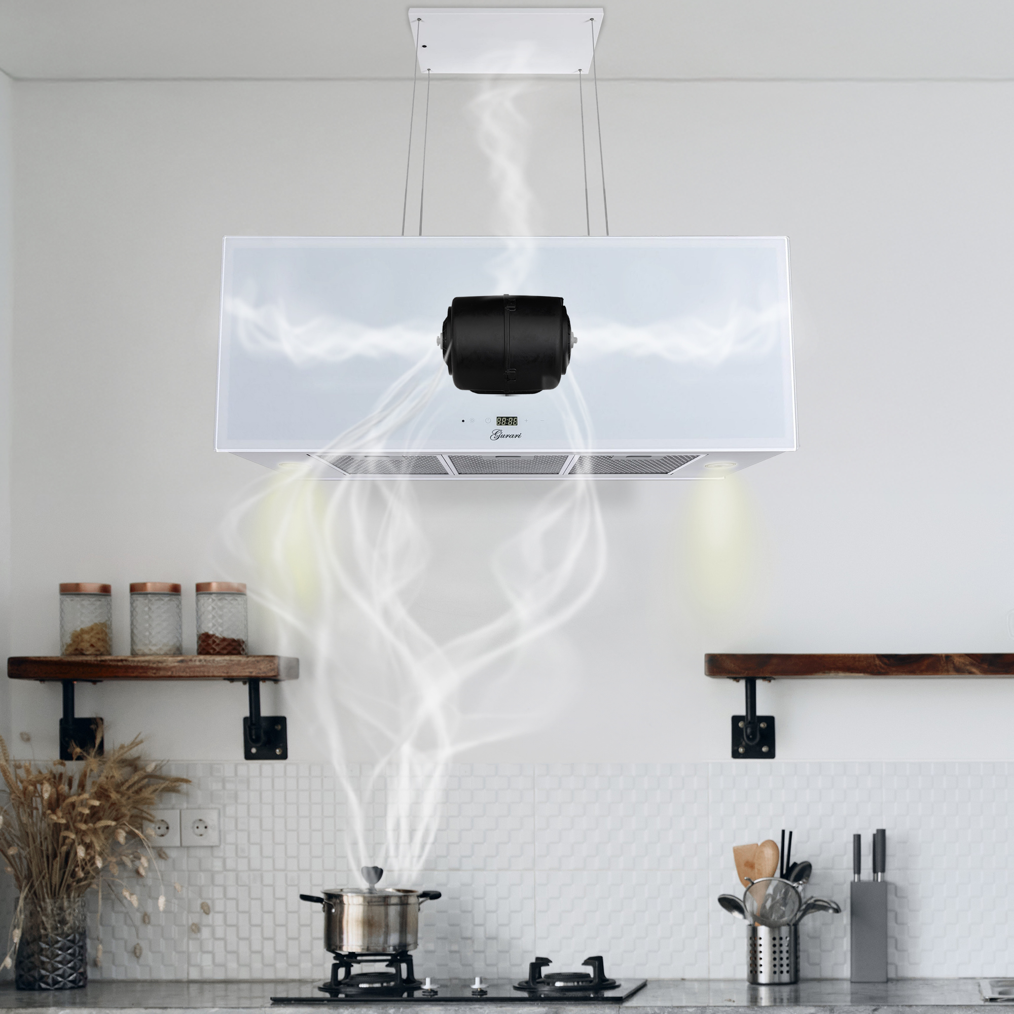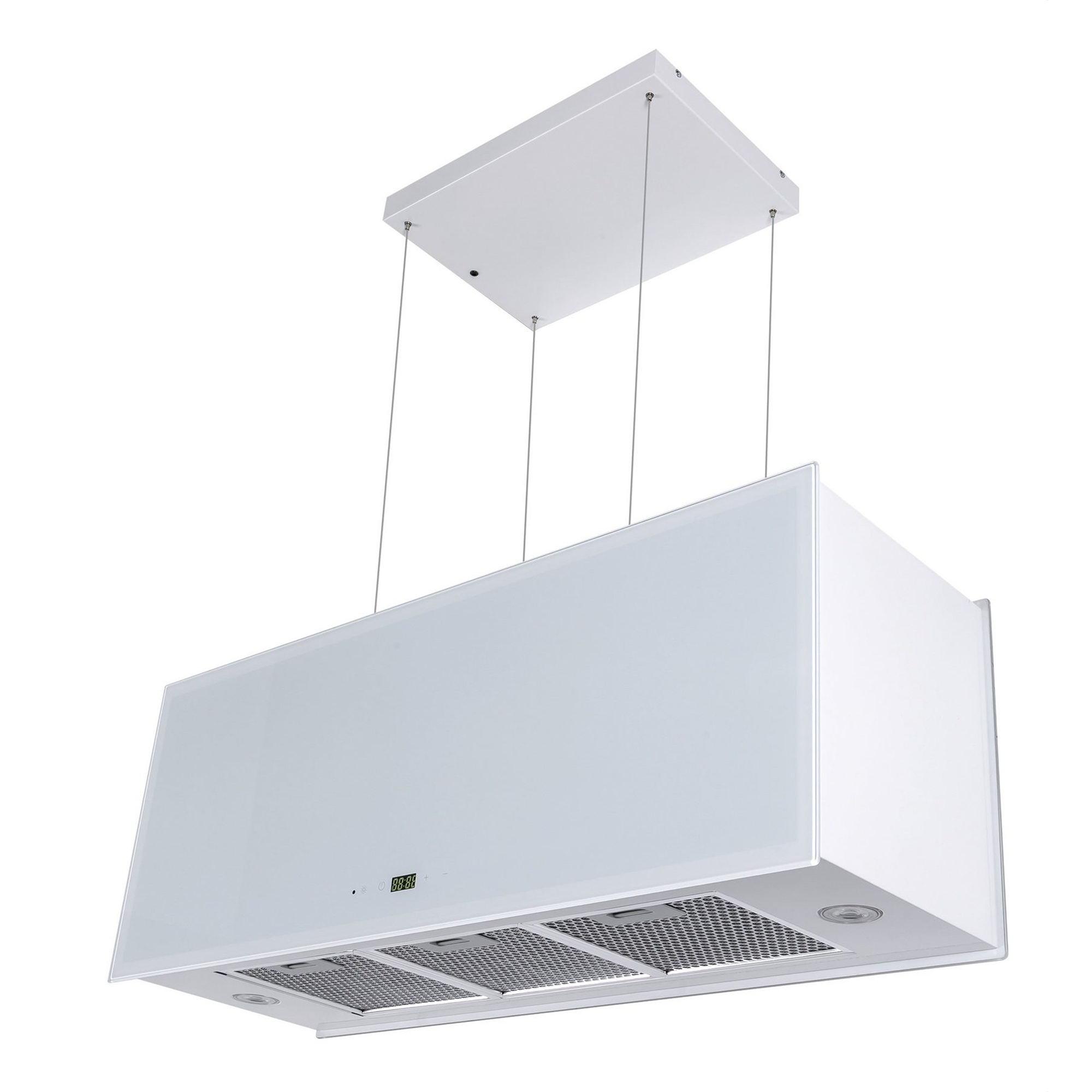Die an 4 Seilen abgehängte Umluft Inselhaube GCH I 333 90 WH PRIME N ist komplett in Weiß gehalten. Auf der Vorderseite befindet sich eine 4-stufige (+ Turbo) “Touch Control” Steuerung.