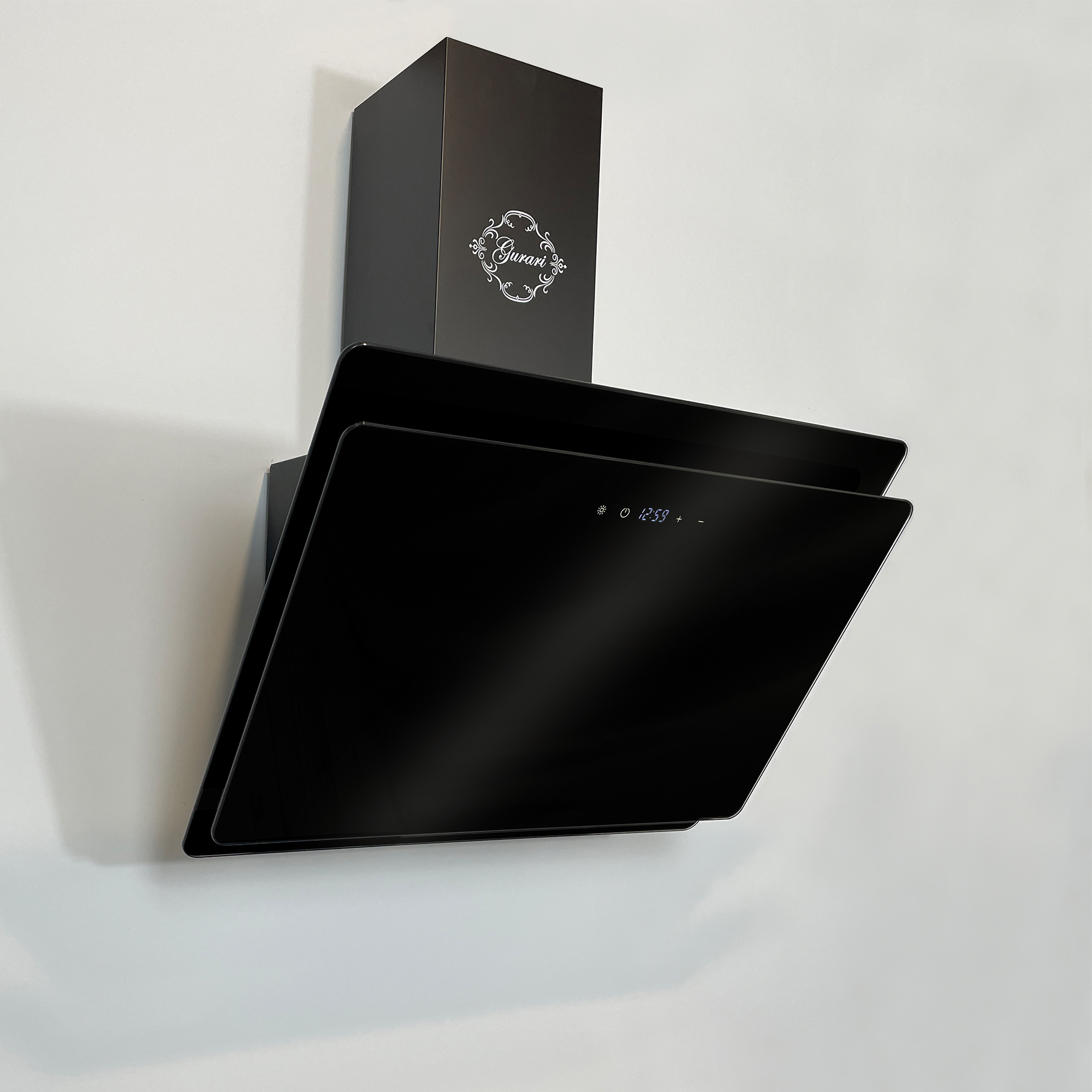 Das Modell GCH S 411 60 BL PRIME N ist eine moderne Dunstabzugshaube in kopffreier Bauweise. Korpus und Kamin sind schwarz lackiert. Die Front besteht aus Schwarzglas und ist in zwei Teile unterteilt
